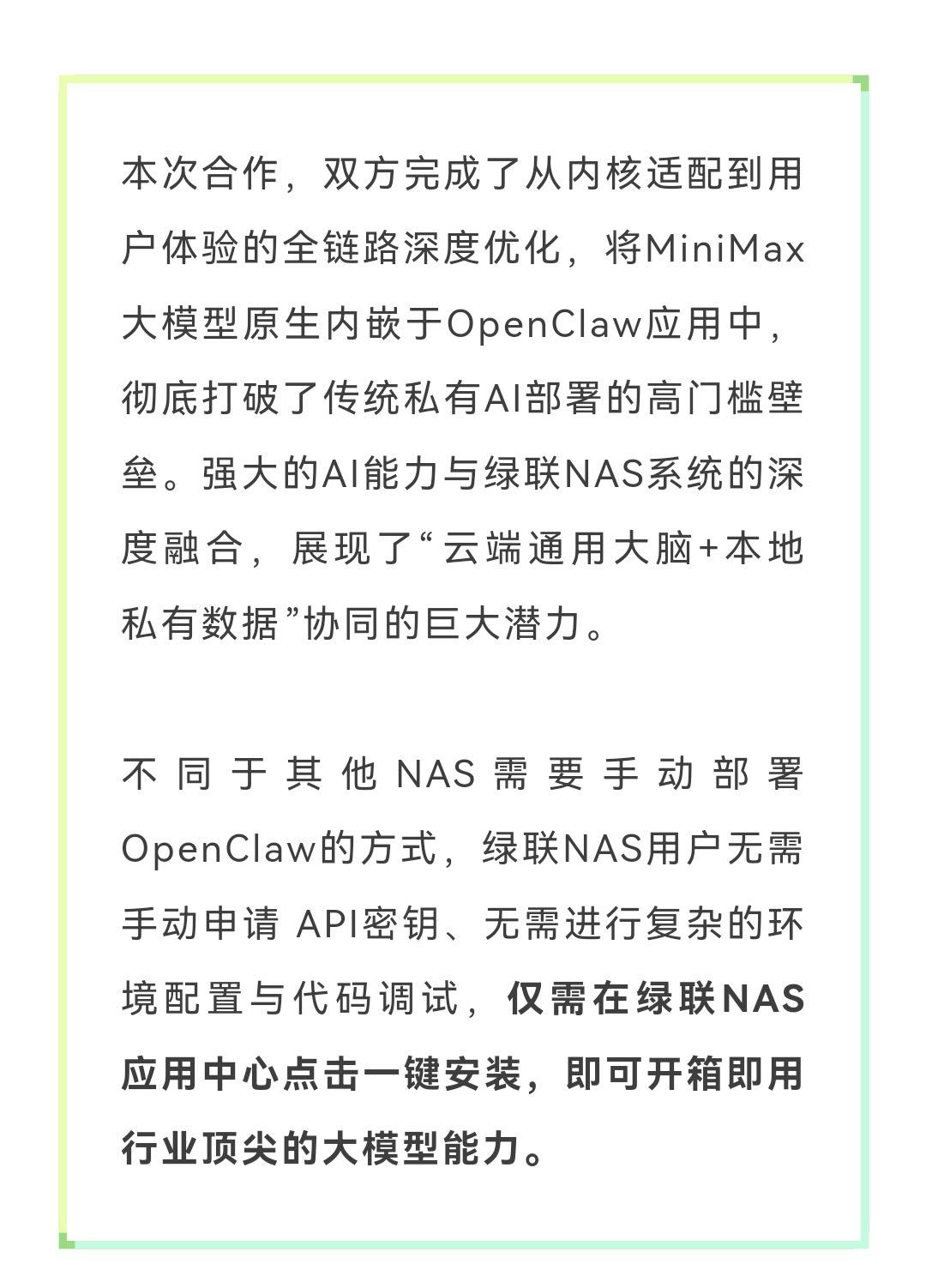 NAS行业首家,原生内嵌MiniMax大模型,OpenClaw开箱即用!绿联NAS应用中心一键安装,一会就安装试试看。👉还有30天全量免费使用。绿联NAS私有云 OpenClaw
