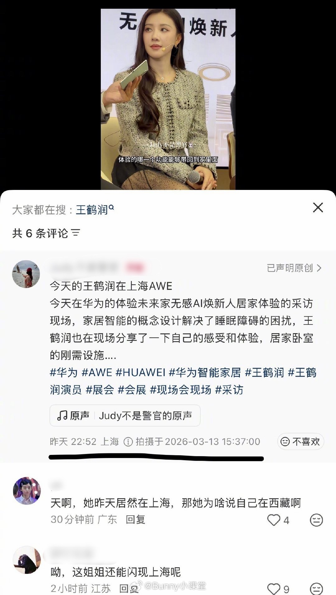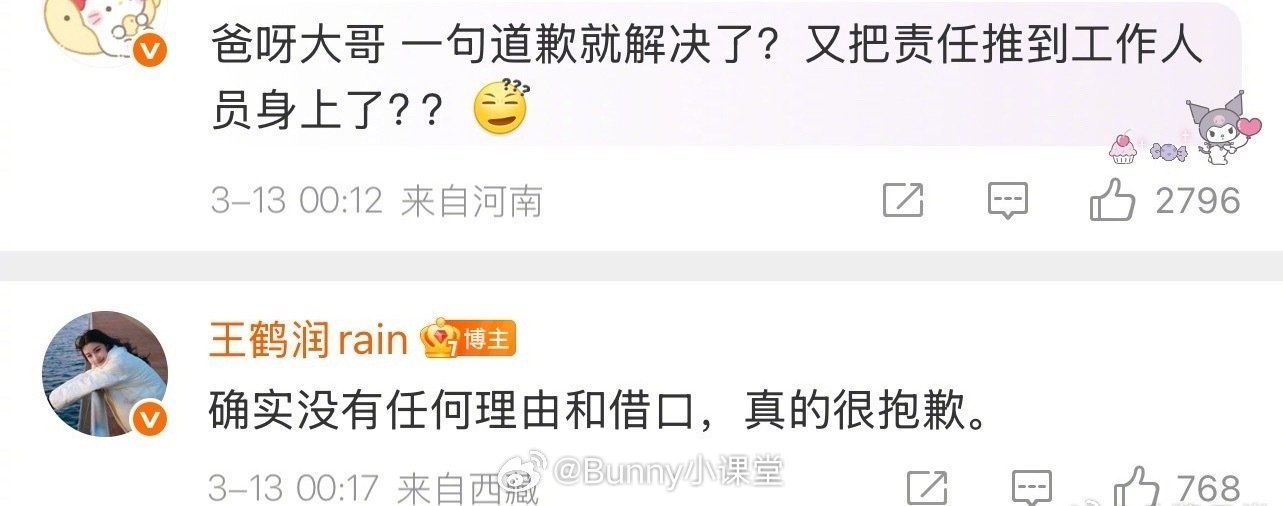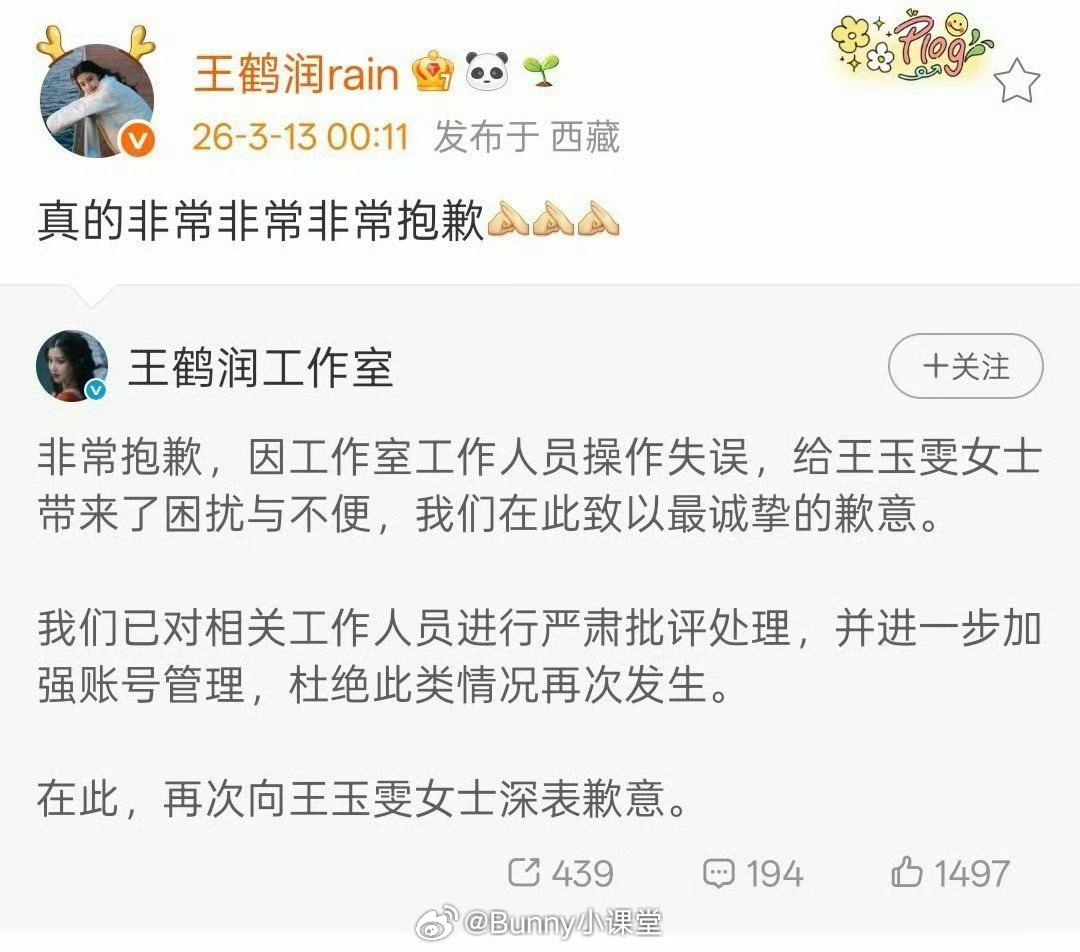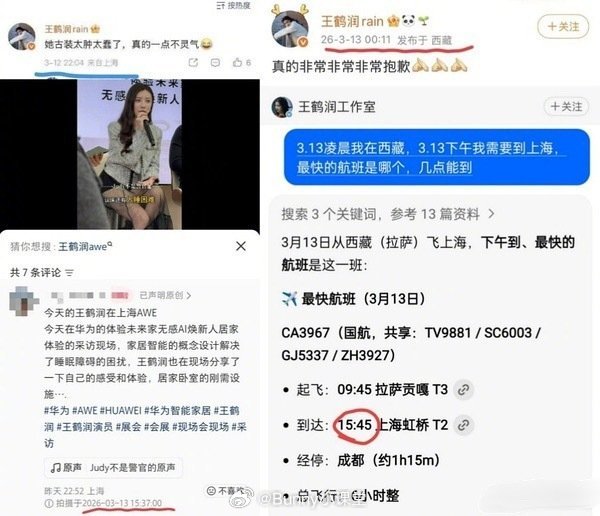 王鹤润评价王玉雯事件疑似有反转!3月12日晚上10点,王鹤润账号评价王玉雯,IP地址显示在上海;3月13日00:11王鹤润转发道歉,是工作人员失误,IP地址显示在西藏;3月13日15:37王鹤润已经在上海参加活动,而当天拉萨到上海唯一航班是上午09:45起飞,15:45才能抵达上海……这不是矛盾吗?