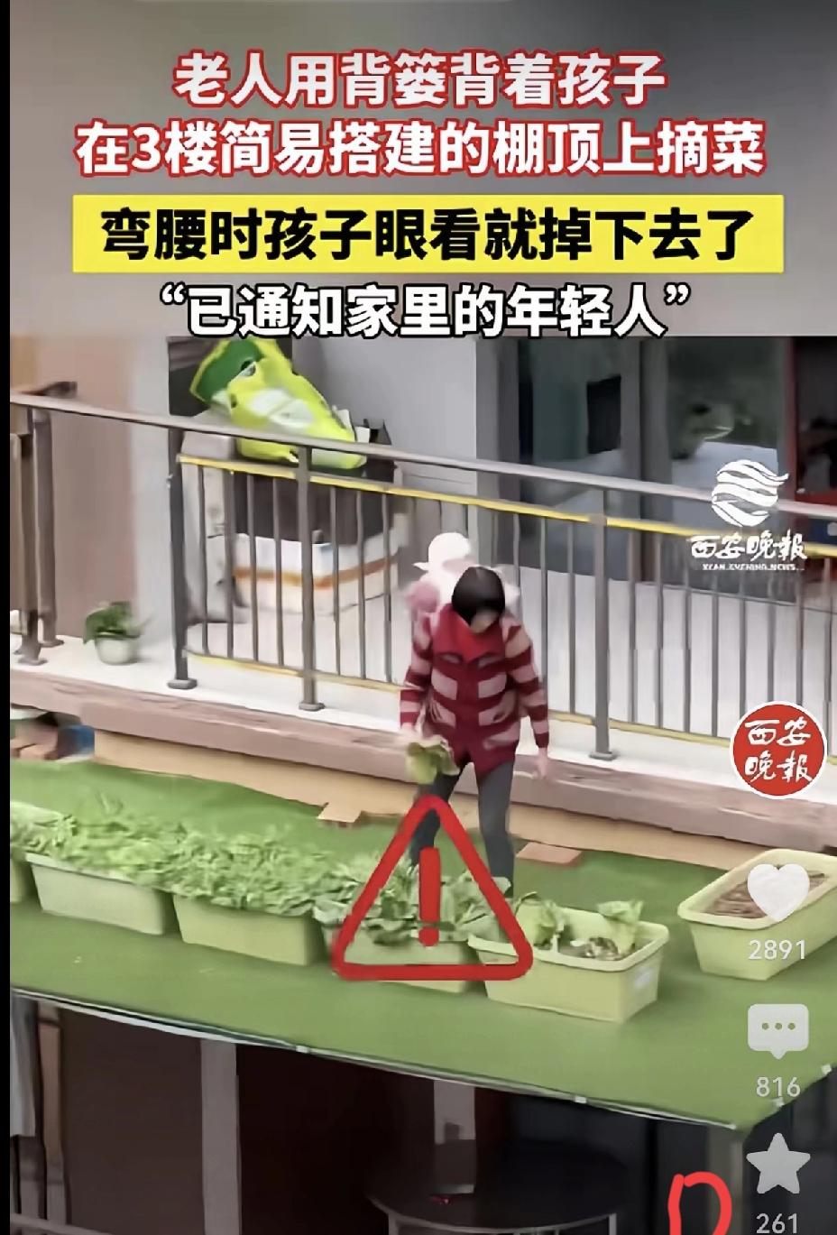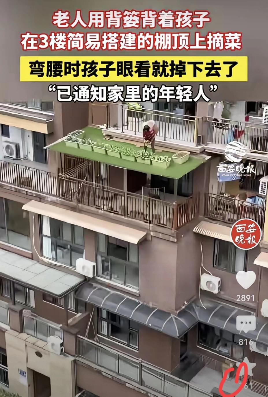 楼顶背娃摘菜的惊心一幕,藏着最让人揪心的现实无奈 高空无护栏的楼顶,老人背着孩子弯腰摘菜,孩子随时可能滑落的画面,让每一个看到的人都揪紧了心。这不是简单的疏忽大意,而是普通家庭带娃困境最真实的写照。 老人不是不爱孩子,只是既要帮忙照料又想为家里分担,才在无奈中忽略了致命的安全隐患。而楼顶违规搭建的菜地无人管控,物业未能及时履职,更是把危险摆在了明面上。 比起一味指责老人,我们更该看见背后的难处。双职工家庭无人看顾孩子,老人力不从心却仍在硬扛,安全的缺口从来只靠家人小心填补,远远不够。 安全从来没有侥幸,意外也不会给人重来的机会。面对这样的带娃难题和小区安全漏洞,你觉得该从哪些方面去真正杜绝危险的发生?