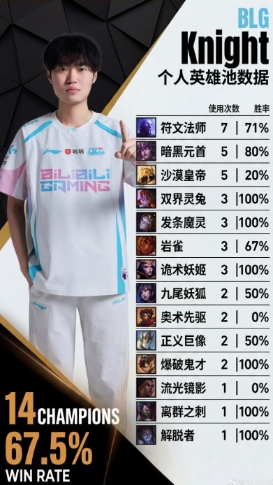 BLGKnight14个英雄,选用最多的英雄为瑞兹(7次),胜率71%