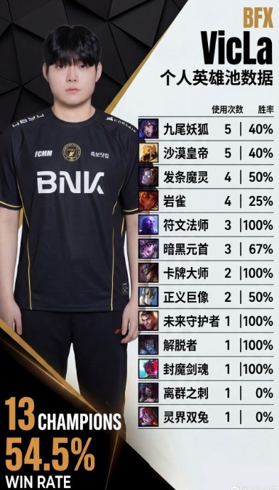 BFXVicLa13个英雄,选用最多英的雄为阿狸和沙皇(5次),胜率40%