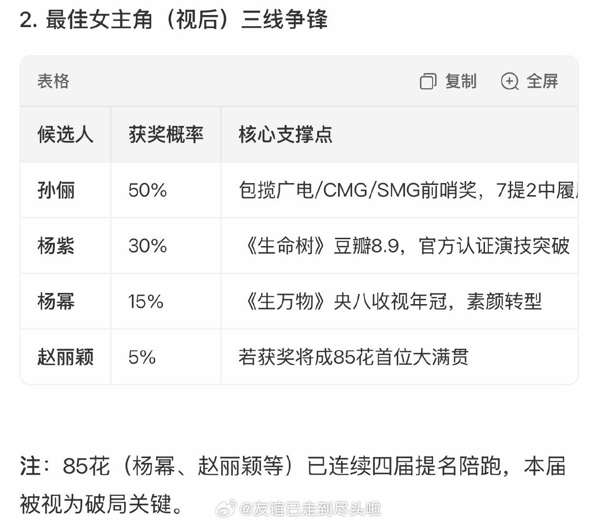 这次白玉兰视帝视后提名,各种分析预测基本集中在这几个上了:最佳男主角:于和伟、肖战,胡歌、郭京飞、白宇有一定可能最佳女主角:孙俪得奖率最高,其次是杨紫、杨幂、赵丽颖 第31届白玉兰奖 白玉兰预测 2026白玉兰提名名单预测