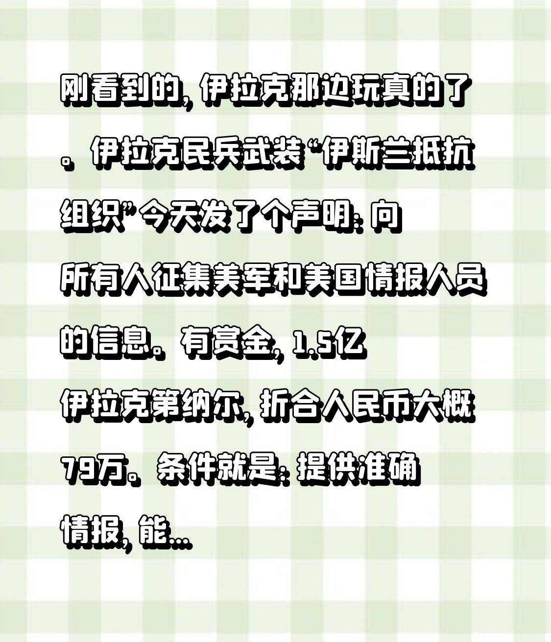 刚看到的,伊拉克那边玩真的了。 伊拉克民兵武装“伊斯兰抵抗组织”今天发了个声明:向所有人征集美军和美国情报人员的信息。 有赏金,1.5亿伊拉克第纳尔,折合人民币大概79万。 条件就是:提供准确情报,能直接帮他们抓到人或者干掉人,尤其是针对美军高级官员或者情报机构领导人的,就拿钱。 同一天他们还说了另一组数据:过去24小时,对伊拉克及其周边的美方目标发动了31次袭击。从2月28号算到现在,已经打了335次。 平均31次一天,335次不到半个月。 什么叫高强度?这就叫高强度。无人机、火箭弹轮着来,一天不落。 有网友说,335次袭击加公开悬赏,伊拉克民兵这波操作直接把压力拉满!美军在中东的霸权行径早就让当地积怨已久,如今从军事基地打击到精准锁定情报人员,这波反制既狠又准,美方的被动都是咎由自取,中东的局势这下更难收场了。 不到半个月发动335次袭击,还公开悬赏79万抓美军情报人员,中东局势彻底失控,平民与美军都陷险境,太危险了。 美国政府在阿富汗的战争中吃了多大的亏难道忘记了?这么快又在阿拉伯国家发动没有指望的战争! 对此你怎么看?