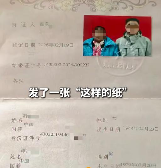 湖南湘潭,47岁的男子求娶82岁的谢奶奶,还送上了20个鸡蛋和1000元钱,谢奶奶以为去领假结婚证,于是就跟着去了,谁知道对方却来真的,还有户口的迁移手续,这时谢奶奶着急了,谢奶奶的儿子和孙子也生气了,直接将谢奶奶送到了男子父母家中,质问他们办的好事情,可是对方的父母却说,你们有什么权利把她送到这里来?事情也怪不得我们,是你自己奶奶同意的,可是谢奶奶却说,我又不认识字,要是知道是真的结婚证,我才不会来。 3月11号这天,一位记者接到了一通语气急促又带着怒火的求助电话。 挂掉电话,记者没敢耽搁,立马收拾东西赶去了当事人家里,心里满是疑惑。 见到记者,老人也没有丝毫拘谨,拉着记者的手就打开了话匣子,说起领证的事儿,语气里全是不解。 那个男子主动找上门来,跟她说了一大堆话,她听得云里雾里,只记得对方后来说要跟她去结婚,并且还会给她20个鸡蛋和1000元钱当做彩礼。 老人一直以为这就是一场闹着玩的闹剧,觉得那张纸片也是男子忽悠她的,只是个假的证件什么的。 毕竟她都82岁了,头发都白完了,怎么可能有人真心愿意跟她结婚,还是个比自己儿子年纪还小的中年人。 老人一边说,一边慢慢伸出发抖的手,从口袋里摸索出那张结婚证。 记者仔细一看,证件上的信息齐全,两人的照片清晰,上面的钢印也清清楚楚,确确实实是正规的结婚证,绝非老人以为的那种假纸片。 记者后续核实得知,这两人早在2月9号就已经办完了结婚登记手续,拿到了结婚证,距离记者接到求助电话,已经过去了整整一个多月。 这一个多月里,老人由于不认识字,压根不知道它意味着什么,更不清楚自己已经在法律层面,和那个47岁的男子成为了夫妻。 直到有一天,老人的儿子整理母亲的衣服时,无意中从她口袋里翻出了这张结婚证,追问之下,才从老人嘴里得知了结婚证和1000块钱和20个鸡蛋彩礼的事儿,一家人瞬间又气又急。 他们笃定自己的母亲是被人欺骗了,而且以老人的认知,根本不可能主动同意和一个比自己小这么多的人结婚。 他们作为家人,绝不认可这场荒唐的婚事。于是他们就带着老人,一起找到了那个男子的家里。 开门的是男子的母亲,年纪也不小了,看到老人和她的儿子、孙子一行人,脸上没有丝毫意外,反而写满了不耐烦。 面对老人儿子的质问,男子的母亲却显得十分淡定,不管对方怎么说,她都只反复念叨一句话:“这婚事是老太太自己同意的,别的我什么都不知道,也别问我。” 不管老人的儿子和孙子怎么追问,她既不解释自己儿子为什么要和一位82岁的老人领证,也丝毫没有要解决问题的意思。 而截至目前,那位男子始终没有出面,也没有给出任何回应。 这件事被发布到网络上之后,很快就在网上掀起了轩然大波,网友们纷纷热议,几乎所有人都觉得,这场婚姻绝非表面看起来这么简单。 其中,被讨论最多的猜测,就是男子领证的目的可能和拆迁补偿有关。 还有网友推测:“男子可能是欠了不少外债,想通过这种特殊的婚姻方式,转移财产、逃避债务。” 除此之外,也有网友忍不住调侃:“这位男子,这一结婚,一夜之间辈分直接拉满。” 对此,你们怎么看? (信息来源:上观新闻《有猫腻?47岁男子和82岁老太领证结婚,1000元和20个鸡蛋当彩礼!》、深圳新闻《47岁男子娶82岁老人 彩礼是1000元和20个鸡蛋 老人:以为是领假结婚证》)