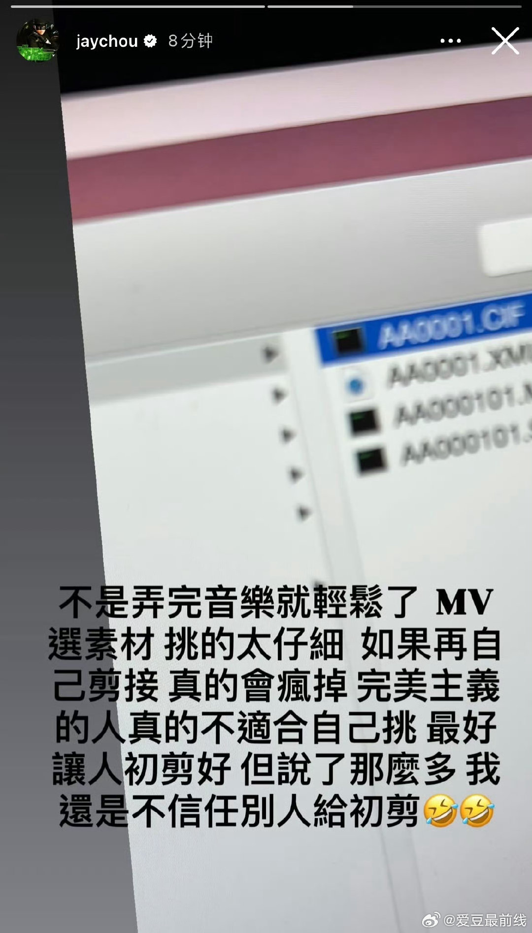 周杰伦对音乐完美主义 杰伦说mv素材挑得太仔细,再自己剪接真的会疯掉,但又信不过别人初剪。这种纠结太真实了,正是因为你对自己作品这么严格,我们才能看到那么多用心的画面。3.24快点来吧!