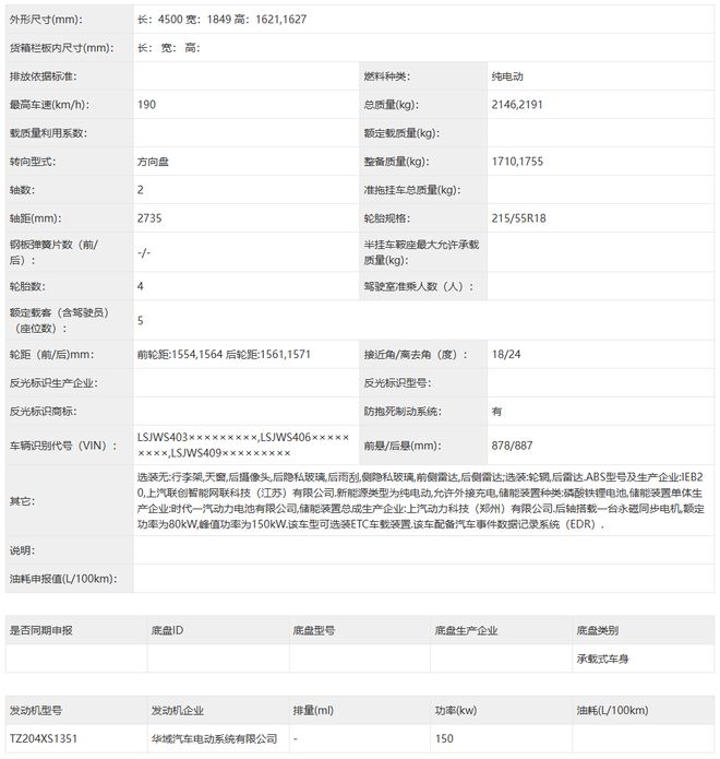 申报信息显示,这款新车长宽高为4500mm*1849mm*1621(1627)mm,轴距为2735mm。后轴搭载一台永磁同步电机,额定功率为80kW,峰值功率为150kW。