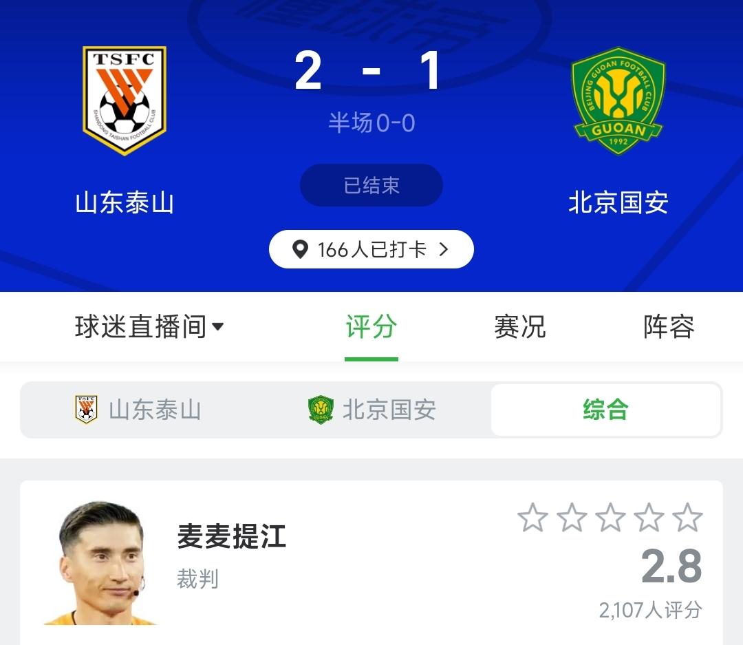 京鲁大战,麦麦提江这个判罚呀,两边都不讨好!全场不绝于耳的**声,宣告着球迷的不满。 几乎可以称得上是中超春晚的山东泰山对阵北京国安队的京鲁大战,在他的吹罚下,整场比赛踢得稀碎,流畅性和观赏性都极大程度上的下降。不过好在没有出现重大的误判,也没能影响比赛的进球和最终的结果。 纵观全场,无论是他的判罚尺度统一标准,还是对比赛节奏的把控能力,都让双方的球迷很难满意,在赛后的评论区,接近90%的球迷给他打出了仅仅只有一星的评价,其综合评分也仅仅只有2.8分。 作为中足联和足协近些年力推的年轻裁判,麦麦提江如果想要取得更大程度上的进步,想要在未来赢得更多球迷的认可,或许还需要有很多的路要走。山东泰山
