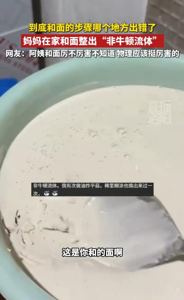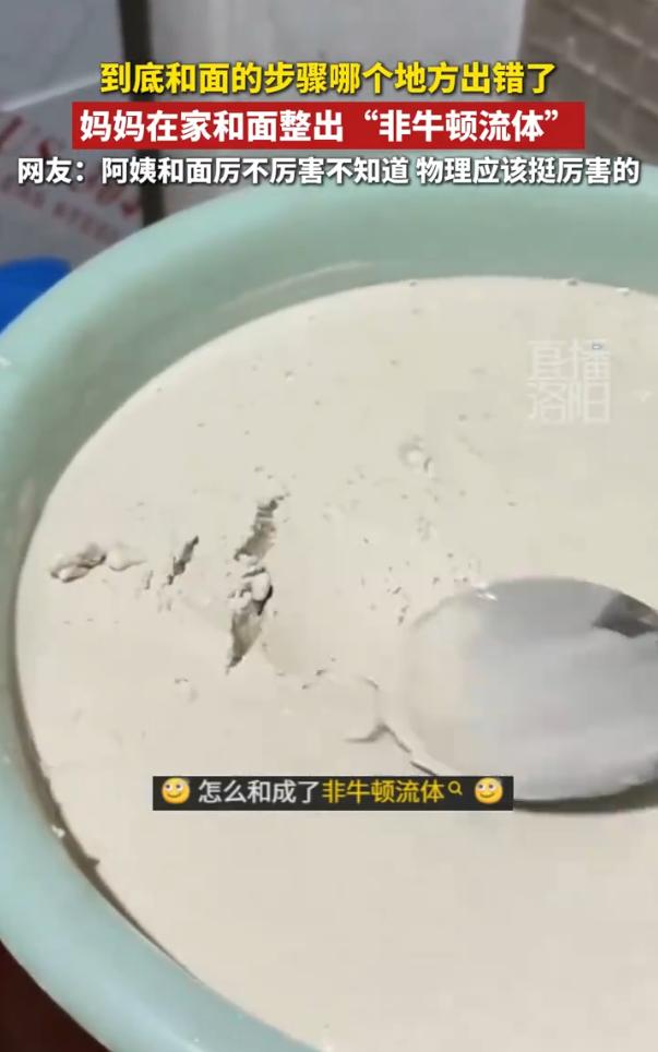 “这到底是哪个步骤出了问题?”河南,一女子在家里和面,不料和着和着就发现,外表看着像是一盆水,可近距离一碰却是面,好好的面被弄成了“非牛顿流体”,女儿怎么也想不明白,为什么会这样。网友:阿姨和面厉不厉害不知道,物理应该挺厉害的 女子本想和面做点好吃的,结果和着和着,面盆里的东西看起来像是一盆水,表面平静得很。她伸手一碰,怪事来了,明明是稀得像水的东西,竟然有固体的质感,勺子敲下去还能感觉到阻力 这不就是物理课上学过的非牛顿流体吗? 女儿看着妈妈的和面成果笑得不行,拍下视频发到网上求助:这到底是哪个步骤出了问题?好好的面怎么会变成这样? 视频里,盆里的面糊表面光滑,轻轻晃动时确实像液体一样流动。可勺子一敲,底部明显有阻力,像是敲在了软软的固体上。母女俩看着这神奇的作品,除了笑,也想不明白为啥会这样。 有网友说:这不就是玉米淀粉和水的经典配方吗,没想到用面粉也能做出类似效果 说起来,非牛顿流体的特点就是遇强则强。你慢慢伸手进去,它像液体一样温柔包裹;你用力敲打,它瞬间变得像固体一样坚硬。这种特性在玉米淀粉和水的混合液中最常见,没想到面粉和水也能达到这种状态 那问题来了,好好的面团为什么会变成非牛顿流体? 关键在于水和面粉的比例。正常和面,水要一点点加,边加边揉。如果一次性加水太多,或者加水后搅拌不充分,面粉颗粒没能充分吸收水分形成面筋网络,就会悬浮在水中,形成这种特殊的物理状态 简单说,就是水加多了,而且没揉到位 不过话说回来,这种意外和出来的非牛顿流体,虽然不能用来做面条包子,但也别急着倒掉。往里面打个鸡蛋,加点葱花和盐,搅匀了倒进油锅里,能炸出特别松软的咸食。或者少量多次加入干面粉,重新揉成正常面团也行