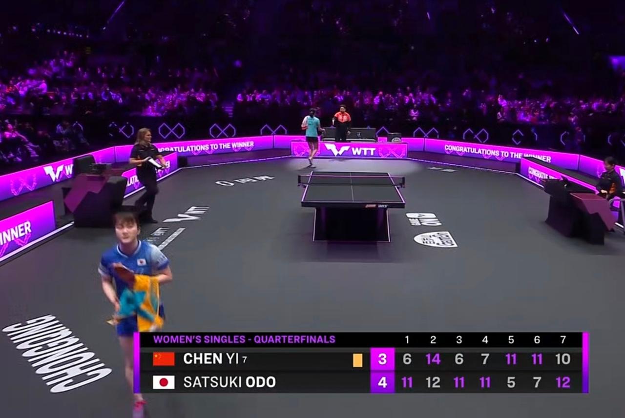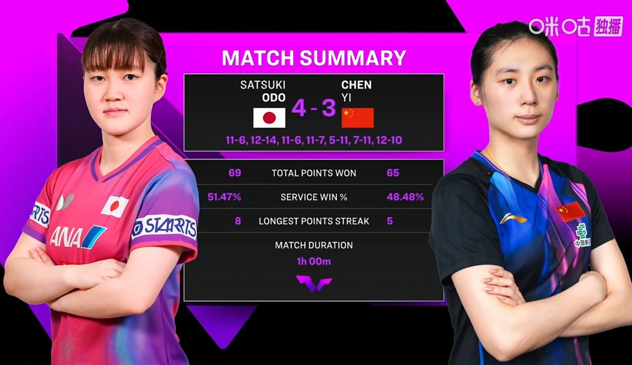 重庆冠军赛丨陈熠3-4惜败大藤沙月无缘四强 重庆冠军赛 重庆冠军赛 女单1/4决赛上演七局苦战,中国选手陈熠以3-4不敌日本选手大藤沙月,遗憾止步八强,无缘四强。 本场比赛双方争夺异常激烈,比分交替上升,共耗时整整1小时。首局陈熠6-11先丢一城,随后她迅速调整状态以14-12扳回一局。但大藤沙月凭借更稳定的发挥,以11-6、11-7再下两城,将比分扩大至3-1。 绝境之下,陈熠展现出顽强斗志,以11-5、11-7连追两局,将比赛拖入决胜局。决胜局双方比分紧咬至10-10,关键时刻大藤沙月把握机会连得两分,以12-10锁定胜局,最终总比分4-3淘汰陈熠。 本场比赛数据统计显示,大藤沙月全场拿下69分,发球得分率达51.47%,并打出过8分的连续得分高潮;陈熠则收获65分,发球得分率为48.48%,最长连得5分。这场胶着的对决也让球迷看到了两位选手的坚韧与实力。