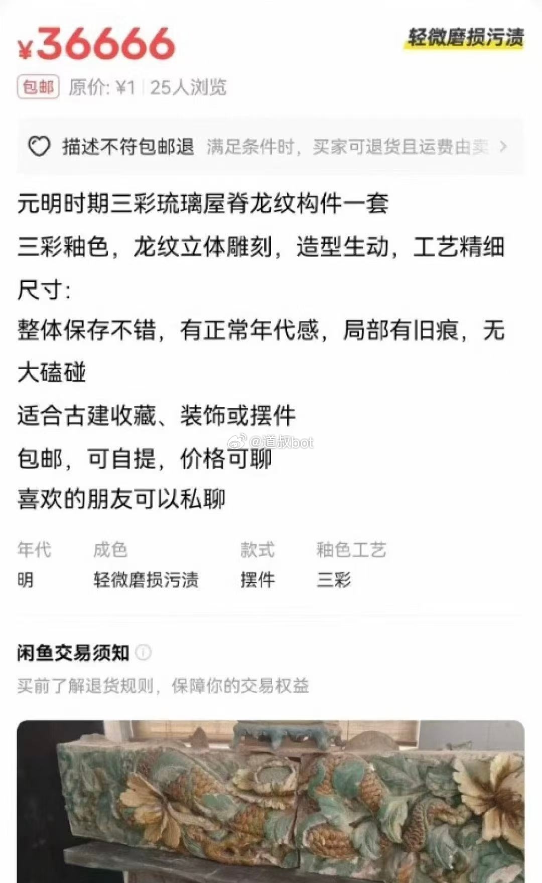 6啊,有小偷偷了国保夏禹神祠的正脊琉璃,拿闲鱼当销赃平台了,挂了36666在闲鱼