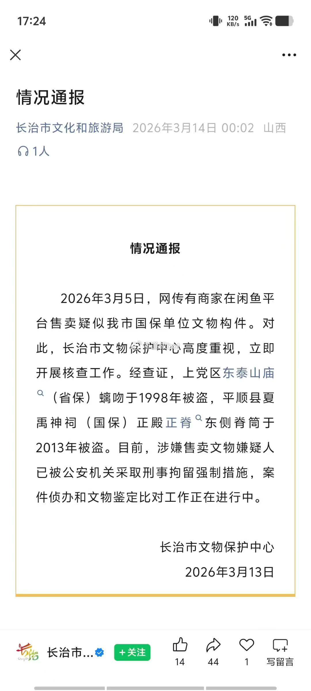 官方通报被盗国保琉璃被公开售卖这不是什么仿制品。平顺县文旅局副局长亲口承认:“