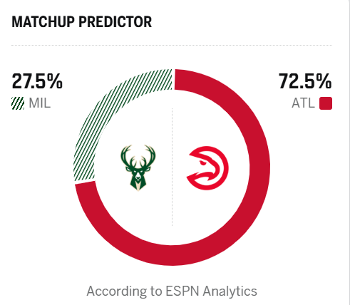 ESPN预测明日比赛:老鹰胜率高达72.5%,雄鹿胜率27.5%