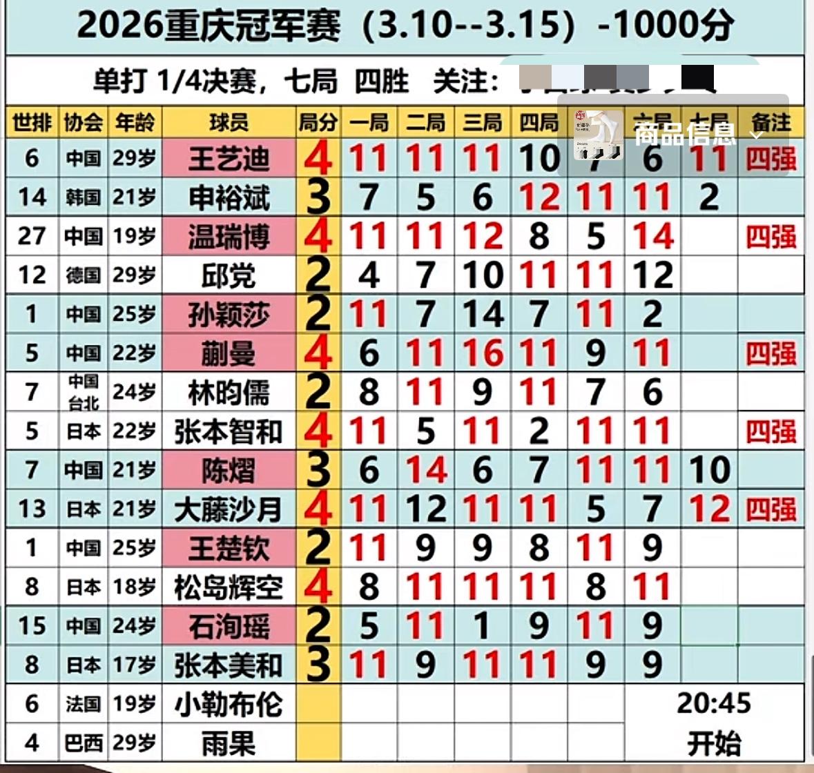 重庆冠军赛女单四强出炉——3月15日赛程出炉:温瑞博VS张本智和! 石洵瑶2:4
