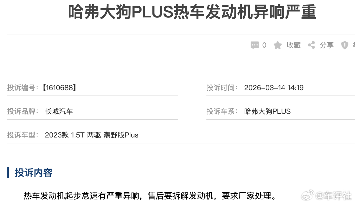 汽车315线上车展【网友:哈弗大狗PLUS热车发动机异响严重】 近日,有网友投诉称,他购买的是哈弗大狗PLUS(2023款 1.5T 两驱 潮野版Plus),热车发动机起步怠速有严重异响,售后要拆解车发动机,要求厂家处理。 据车评社了解,哈弗大狗 PLUS 2023 款 1.5T 两驱潮野版 Plus,指导价 13.58 万,1.5T 动力够用,配置丰富且空间宽裕,兼顾城市通勤与轻度户外,性价比中肯。
