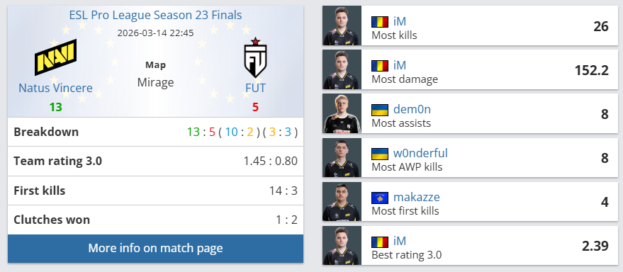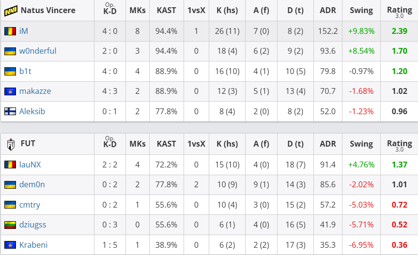 个人表现上,NAVI核心选手iM彻底爆发,全场砍下26击杀、152.2ADR的恐怖数据,并送出7次助攻,以2.39的惊人rating统治赛场;w0nderful贡献18击杀、93.6ADR,rating1.70;b1t也有16击杀入账。FUT方面则全线低迷,仅lauNX拿到15杀、1.37rating勉强支撑,dem0n送出9次助攻并在残局中两次获胜,但全队整体火力严重不足,无人得分上双。整场比赛NAVI从开局便牢牢掌控局势,以摧枯拉朽之势碾压FUT,强势先下一城。