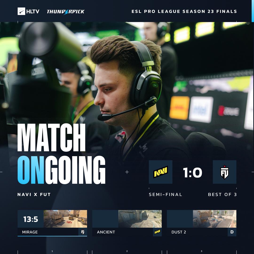 在EPLS23半决赛中,NAVI与FUT展开图一Mirage(荒漠迷城)的较量。NAVI全场碾压,以13-5的比分轻松战胜FUT,拿下开门红。比赛上半场,NAVI作为防守方打出10-2的悬殊比分,几乎提前杀死比赛悬念;下半场双方战成3-3平,NAVI最终以13-5锁定胜局。团队数据方面,NAVI全面占优:团队rating高达1.45,而FUT仅有0.80;首杀数以14-3遥遥领先;残局方面FUT虽以2-1略占优势,但无力改变战局。