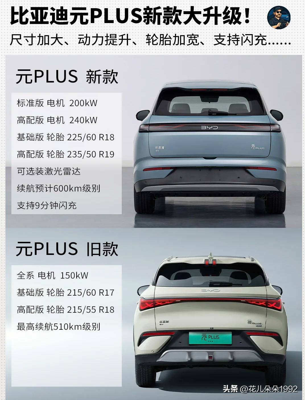 元PLUS新款来袭:尺寸动力大升级,还有闪充 比亚迪元PLUS终于要大改款了 我一直很喜欢这台车,最小保有量也很大的小SUV电车,不管是外形设计,还是三电配置都很优秀,也是比亚迪入门级纯电SUV里边,底盘素质最扎实的了。 不过元PLUS的内饰很抽象,设计师说充满了健身房和音乐元素,还有一个不知道怎么开的门把手,我估计新款都会改掉。 新款元PLUS的设计看上去更稳重了一些,有点像大唐的风格,没有之前那么灵动了,后尾灯也变得普普通通,就像兄弟车型海狮05EV一样。 不过尺寸加长了足足21厘米,舱内空间肯定大了不少;动力也太提升,起步就是200kW,高配240kW,比以前的150kW强多了,另外还配了更宽大的轮胎 作为新一代车型,这台车肯定有刀片电池2.0,还有9分钟就能充满电的闪充,以及可选装激光雷达。如果加量不加价的话,我个人觉得这是比亚迪最值得买的纯电SUV。