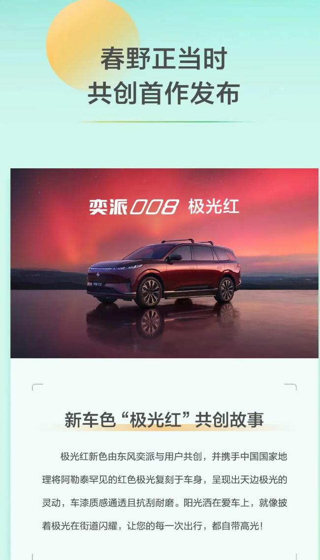 东风奕派正式官宣「奕家人」IP,五大服务承诺+各种权益,还有官方认证的车友会。同时三款新车亮相,各有升级,满足不同出行需求。奕派008上新“极光红”车色和“春野套件”,是东风奕派和用户联合开发的;奕派007闪现版官宣3月28日正式上市,属于官方改装定制车型,现在预定已开启,有先享礼+缤纷礼;纳米01Cross也同期首发,推出“苍山灰”全新车身颜色。后续东风奕派还会推出大六座SUV、超舒适大空间SUV、高性能轿跑等多款新车。【来自懂车帝车友圈】