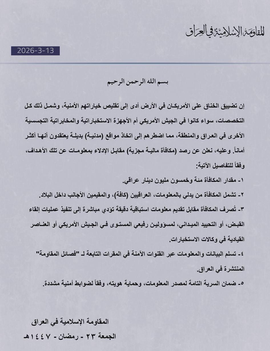 自从伊拉克坠毁一架 KC-135R 之后,中东空域的美军加油机基本全部打开应答器。 现在连在英国活动的 B-1B 也开始公开广播 ADS-B 和 Mode-S 数据。换句话说,美军的大型平台现在基本都是民航可见。 伊拉克抵抗组织媒体发布视频:疑似显示昨天坠毁的美军KC-135加油机在夜间的空中断成两截的过程。 美国和以色列对伊拉克首都巴格达市的两处目标实施了打击,有消息称是实施定点清除行动。 昨天一架被击落的伊朗/其支持的民兵组织的无人机击中了伊拉克首都巴格达阿布格莱布地区的一座发电站,导致其发生爆炸并起火。 不久前伊拉克首都巴格达的美国大使馆遭到了自杀式无人机的袭击。有消息称,袭击目标是美国大使馆内的美国海军陆战队狙击阵地和监测雷达。 伊拉克首都巴格达的美国大使馆被自杀式无人机袭击中可以看到,美军C-RAM防空系统的雷达站被击中并燃烧。 伊拉克国防部:近期美以侵略事件中的烈士家属将获发1000万第纳尔(约合7600美元)抚恤金,伤者获发500万。 ​​​ 据一位知情的伊拉克消息人士透露:继埃尔比勒的哈里尔空军基地遭到袭击后,来自包括法国和意大利在内的五个欧洲国家的数十名士兵已开始撤离该基地,此次撤离行动源于人们对哈里尔基地屡遭袭击日益加剧的担忧。 ​​​ 伊拉克什叶派民兵“伊拉克伊斯兰抵抗运动”发布悬赏令,凡是提供线索帮助抓获美国高级军官或重要情报人员的,无论是伊拉克国民还是外国人,均奖励1.5亿伊拉克第纳尔(约合114600美元)。 ​​​