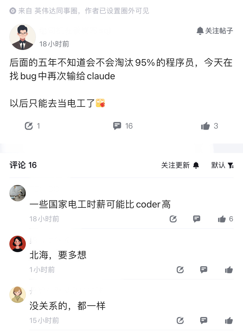 英伟达同事圈,有员工表示,今天在找bug中再次输给了claude,以后只能去当电工了😅