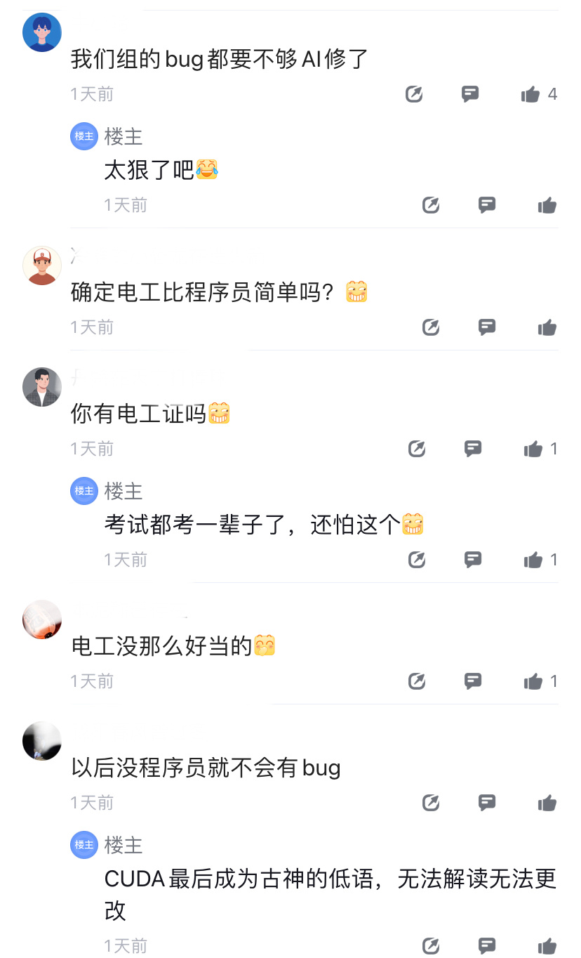 不敢想象,如果英伟达员工也觉得自己不如AI高效,程序员被替代,可能真的就是时间问题了?不过,也有人说CUDA最后会成为古神的低语,无法解读无法更改,这是啥意思?