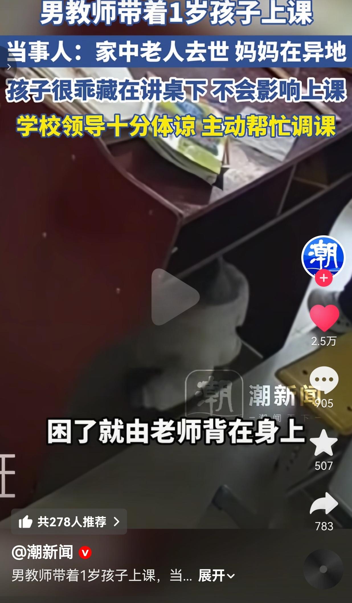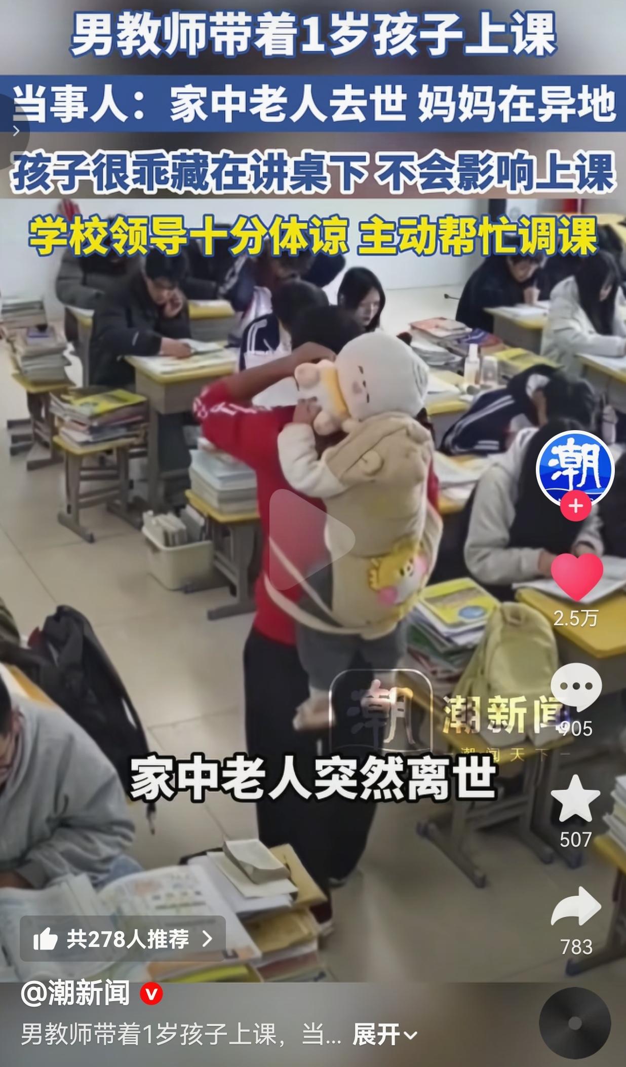破防了!云南男老师把1岁娃绑背上上课,这才是成年人最扎心的崩溃 事情是这样的:云南昭通的訾老师,家里老人突然离世,老婆又在外地打工,1岁的娃没人带,总不能把这么小的孩子锁在家里吧?走投无路之下,他只能把娃带进了课堂里。 你能想象吗?三尺讲台,一边是要对几十个学生负责的教学任务,一边是嗷嗷待哺、黏着爸爸的小奶娃。 上课的时候,娃就安安静静躲在讲桌底下,连个声都不敢出。困了就被爸爸用背带绑在背上,跟着在教室里转来转去,连脚步都放得极轻,生怕惊扰了怀里的孩子,也怕扰了课堂里的读书声。 他不是不想找个人搭把手,是真的没人了。他不是想把娃带进课堂影响纪律,是真的走投无路了。一个男人,上要顾着学生,下要顾着娃,中间还要扛着失去亲人的痛,这种叫天天不应、叫地地不灵的无助,谁能扛得住? 万幸的是,学校领导没有端着架子讲死规矩,反而十分体谅他的难处,主动帮他调整课程,尽量把课排到方便他照看孩子的时段,还反复叮嘱他“别硬扛,有困难就说”,这份人情味,成了压在他肩上的重担里,唯一一点暖光。 有网友看到后评论道:“我也是当爹的,看到这一幕直接破防!谁不想在家好好带娃?谁想背着娃上班?这就是成年人的无奈,连崩溃都要挑时间!” 也有的网友说:“娃才1岁啊!就这么懂事,不哭不闹,看着更心疼!这爸爸得有多难,才舍得让娃跟着遭这份罪?” 还有的网友说:“学校领导还知道主动调课,这已经是万幸了!要是遇到那种只认死理的领导,这老师连课都别想上了,连最后一点活路都要被堵死!” 我真的越看越气,越看越心疼! 凭什么?凭什么一个认真负责的老师,要在“顾学生”和“顾娃”之间做这种残忍的选择?凭什么那些坐在办公室里拍脑袋定规矩的人,永远看不到底层人的挣扎? 我们总说“教育要以人为本”,可当一个老师连自己的孩子都顾不上的时候,所谓的“以人为本”又在哪里?那些喊着“课堂不能有无关人员”的人,有没有想过,这个“无关人员”,是一个走投无路的父亲唯一的牵挂? 这个1岁的娃,比谁都懂事,他知道爸爸在忙,所以安安静静,连哭都不敢大声,只会攥着爸爸的衣角,在讲桌底下自己玩,困了就趴在爸爸背上蹭一蹭,连呼吸都放轻。可这份懂事,恰恰是最让人心碎的地方——他还那么小,就已经在学着体谅成年人的崩溃了。 我不想说什么“加油”“挺住”这种轻飘飘的话,我只想骂一句:这个世界,能不能对普通人多一点善意? 别再用那些冰冷的规章制度,去绑架一个个正在拼命活着的人了。人性,才是最该被放在第一位的东西;良知,才是比任何规矩都重要的底线。就像这所学校的领导,没有揪着“课堂规定”不放,而是选择了体谅和帮忙,这才是教育该有的温度。 当一个男人背着奶娃站在讲台前的时候,他不是一个“不合格的老师”,他是一个在绝境里依然扛起责任的父亲,是一个在苦难里依然坚守岗位的普通人。 最后想送给所有人一句话:别让冰冷的规则,凉了滚烫的人心;别让所谓的“正确”,碾碎了普通人活下去的希望。 对此,你怎么看?