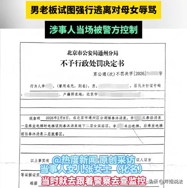 北京,一女子带着妈妈去泡汤泉,两个人洗完澡没有穿衣服,乘坐女士专用电梯前往女宾区休息。而男店主却违规也坐上了这部电梯,正好撞见了没有穿衣服的母女俩,二人吓得不知所措。男店主趁机想要溜走,母女俩赶紧拽住对方,没想到男子直接言语辱骂、出言不逊。气的母女俩立刻就报了警。 报完案之后,涉事人被当场控制,在调取了监控之后,证据确凿,可以证明男店主确实违规乘坐了“女宾专用电梯”上楼。 热度新闻3月13日报道了这则新闻。 张女士为了带着妈妈放松一下,就来到当地比较有名气的汤泉洗浴中心消费。 进入洗浴中心之后,张女士跟妈妈两个人先去女宾服务区泡澡。泡了一会之后,张女士跟妈妈说,她准备先去搓个澡,而妈妈则继续泡澡。 泡的差不多了,张女士的妈妈跟女儿联系,说等下准备从泡池的地方出来找她。因为妈妈也准备去搓澡了。 回头母女俩就准备见面了。张女士的妈妈当时乘坐的是女宾专用电梯,上面明确写了“女士专用,男宾止步”。 按照道理说,一般客人进来,看到这个粉红色的标志,都知道这边是女士区域,男子是不能进来的。 何况,还是本店的老板呢?谁知道,老板明知故犯,大家接下来往后看。 张女士的妈妈乘坐电梯前往搓澡区,此刻,张女士就来到电梯外面等待接应。 谁知道,妈妈电梯门刚打开,就看到里面站着一个男的,这个男的非常巧合,就是本店的男店主,居然违规也进来了。 当时张女士的妈妈就懵圈了,眼看着女儿(张女士)也在外面附近,但是张女士自己也没有穿衣服,三个人都处于很尴尬的局面。 张女士表示,当时的场景,太尴尬了,而且,男子还跟二人对视了一会,之后就准备脚底抹油溜走。 想要逃走,张女士的妈妈可不答应,虽然身上没有穿衣服,但是还是一把拉住了男子。 而张女士也在一旁喊叫,希望制止男店主的行为,让他给个说法。 可是男店主强行要逃走,甚至还出言不逊,对着张女士母女俩一阵辱骂,一番言语刺激了张女士,立刻就拿起手机报了警。 报完警之后没多久,办案人员就过来了,确定眼前这位男子,的确就是洗浴中心的老板。 为何老板要明知故犯呢,明知道这片区域是女子洗澡、搓澡、泡澡的地方,身上肯定毫无遮挡,怎么还想着冒险过来? 一开始男子还抵赖,说不是故意的。但是调取监控之后,发现男店主神情很淡定的走进了女宾区。 不过,令张女士不满的是,最后的处理结果是:不予行政处罚决定书。 这一点让张女士不是很理解,立刻就向相关部门提出了行政复议。 张女士指出,本来就是很隐私的地方,怎么会出现这样的乌龙事件呢?而且对于当事人还不予处理。 母亲回家之后,因为这件事已经心理抑郁,一直在接受心理治疗。 而且医生也出具了诊断书:母亲患有了重度焦虑、重度心理抑郁。这件事,总归要给个说法的。 另外,张女士也将这件事向媒体曝光,记者在给洗浴中心致电了解情况时,对方没有人接听。 有一点立场很明确,在洗浴中心毫无防备的情况下被撞见自己的身体,还产生了心理问题,从法律跟责任角度来看,男老板以及洗浴中心都需要承担相应的法律责任。 据《民典法》第1032条规定,自然人享有隐私权,任何组织、个人不可以刺探、侵扰、泄露他人的隐私,不可以入侵他人的私密空间。 洗浴中心的女宾区、电梯口、通道处,都是典型的私密空间或者眼神地带,消费者在这边脱衣服、走动,都要受到法律的保护。 而男店主,作为洗浴中心的管理者,明知道女宾专用电梯仅限于女性使用,但是仍然违规进入女浴区范围,已经构成对他人隐私的客观侵扰。 责任主体——谁该负责? 第一、洗浴中心管理方要负责。 根据《民法典》第一千一百九十八条规定,经营场所的经营者、管理者需要负有安全保障义务。侵权了就要赔偿,包含医疗费和精神抚慰金。 第二、男老板个人作为直接侵权人要赔偿。 男店主的行为直接违反了《治安管理处罚法》第四十二条规定,偷窥、窃听他人隐私,会被处以5日以下拘留,并且处以罚款。 另外,男子还需要进行民事侵权赔偿,如果长期有此行为,甚至可能要刑事追责。 对于此事,你怎么看?