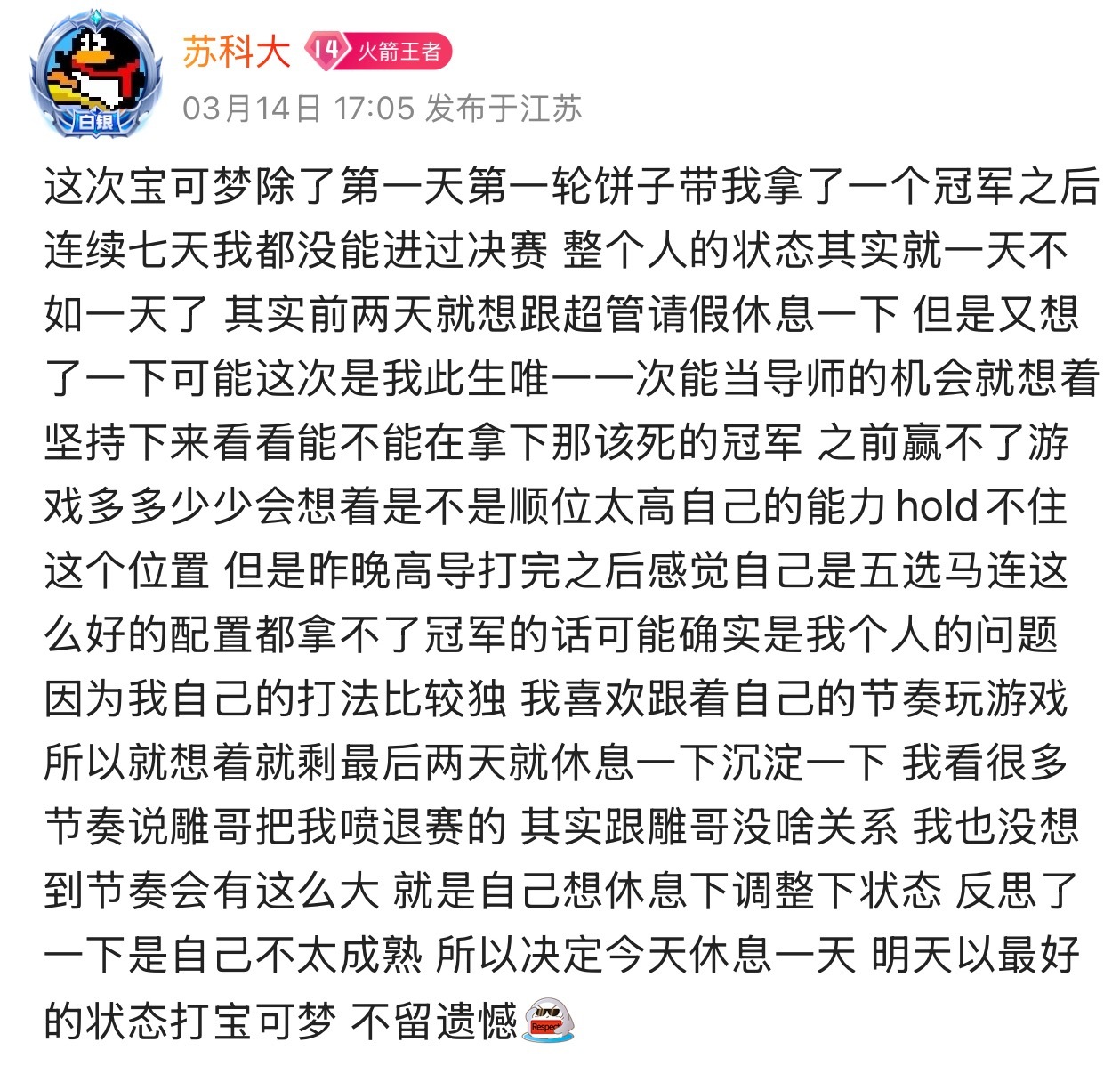 昨天雕哥也是给苏科大还有几兄弟道了歉,苏科大也说了和雕哥没啥关系,休息一天继续打