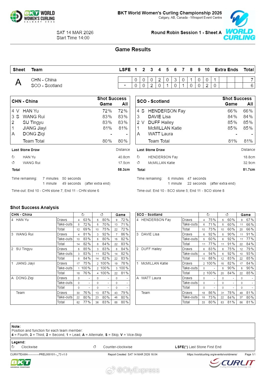【女子冰壶世锦赛中国开门红 加局7-6绝杀苏格兰】2026年女子冰壶世锦赛 3月