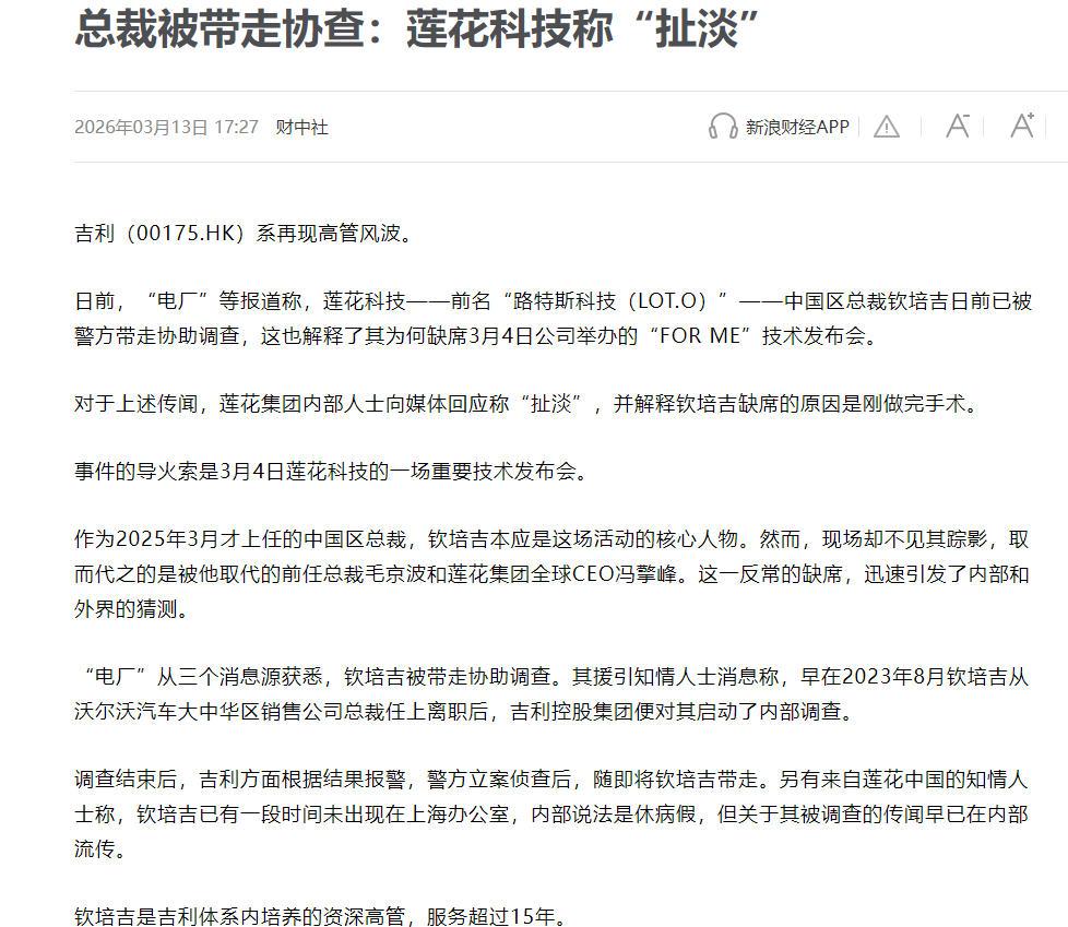 【莲花中国区总裁被传协助调查?内部人士回应:扯淡!钦培吉缺席莲花FOR ME技术发布会引关注】日前,不温不火的莲花跑车并未因莲花FOR ME技术发布会而引发太大关注,但反而因中国区总裁钦培吉的罕见缺席而引发了二次波澜。 日前,据传“财中社”、“电厂”等媒体报道称,莲花中国区总裁钦培吉被带走协助调查。同时,亦有消息指出,有莲花集团内部人员对前述消息进行了否认,相关人士表示:“扯淡”,并透露,钦培吉缺席的原因是最近刚做了个手术。 但值得注意的是,此时距离钦培吉履新中国区总裁一职不过一年。而对上述消息,个人认为还需要让子弹飞一会儿,毕竟不论哪种说法都尚未经证实。你们觉得呢?
