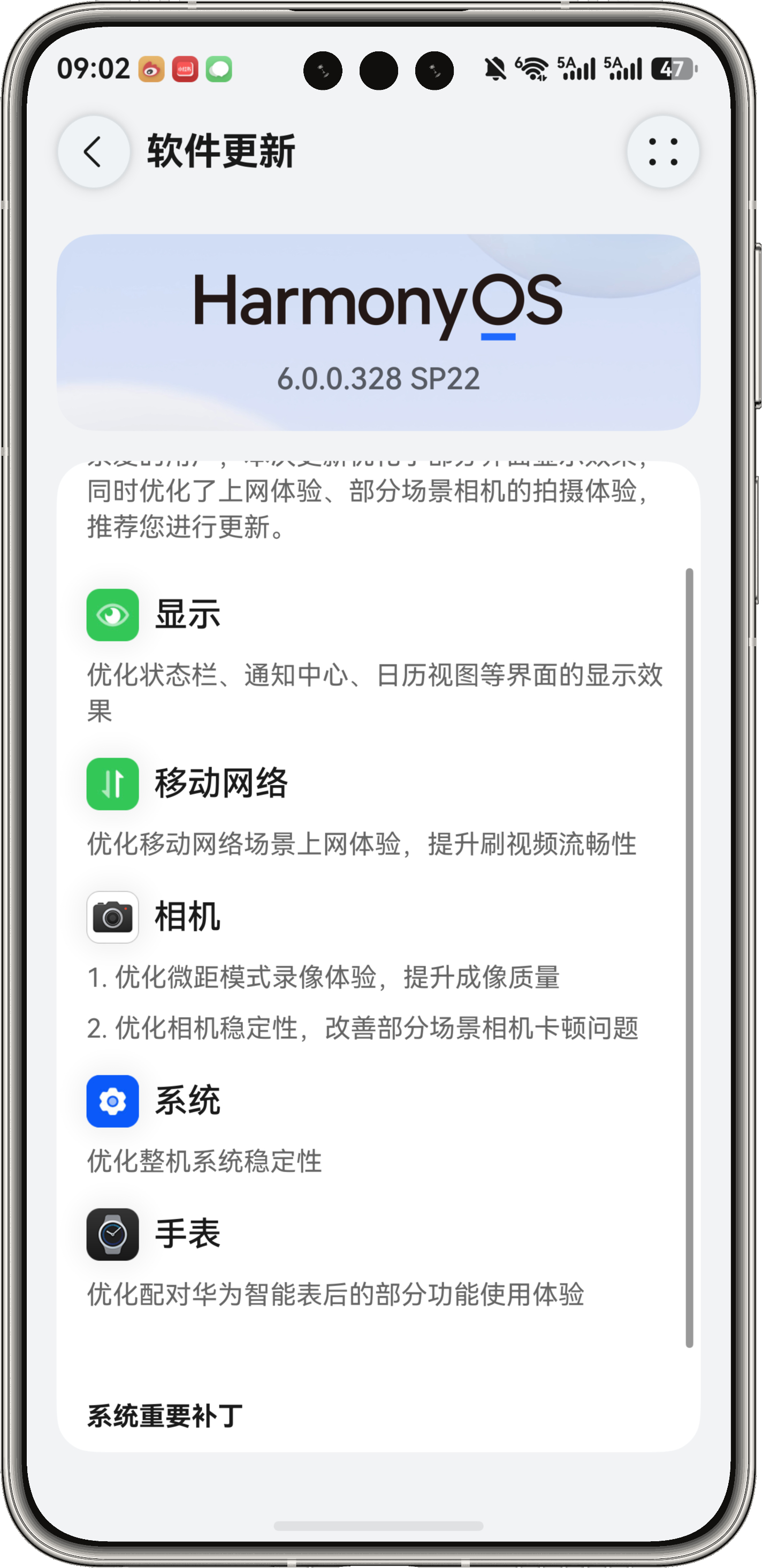 有老铁私信问我,你上次发的鸿蒙新版本没有明细说明,那我再发一次,鸿蒙6.0 .0.328SP22 版本 显示状态栏、通知中心、日历等界面更新,网络流畅度和场景优化,相机体验优化,整体系统稳定性优化,手机匹配手表部分功能可用,老铁们都升级了吗?我的鸿蒙体验harmonyos6可靠的mate