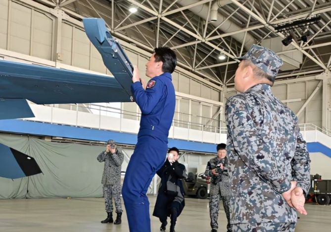 3月8日,东日本大地震15周年前夕,小泉进次郎去了宫城县的松岛基地。按照常规操作,防卫大臣去这种地方,应该是听听汇报、看看灾后重建、给队员打打气。但小泉偏要玩点不一样的:穿上连体飞行服,钻进T-4教练机,还特意要求飞机在福岛第一核电站上空拉烟。