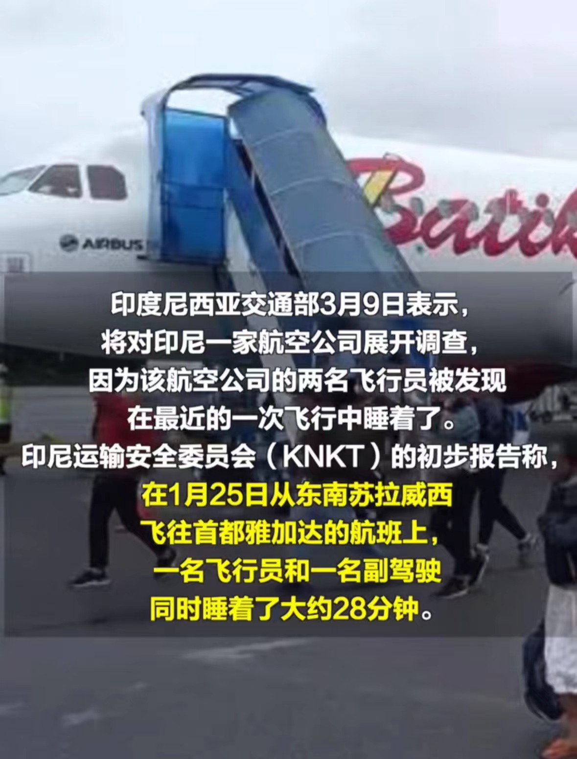 3月10日,据相关媒体报道:在1月25日,巴迪航空公司一架由东南苏拉威西省飞往首都雅加达的飞机上,驾驶舱里的2名飞行人员同时睡着大约28分钟,期间导致飞机偏离了预定的航线。
