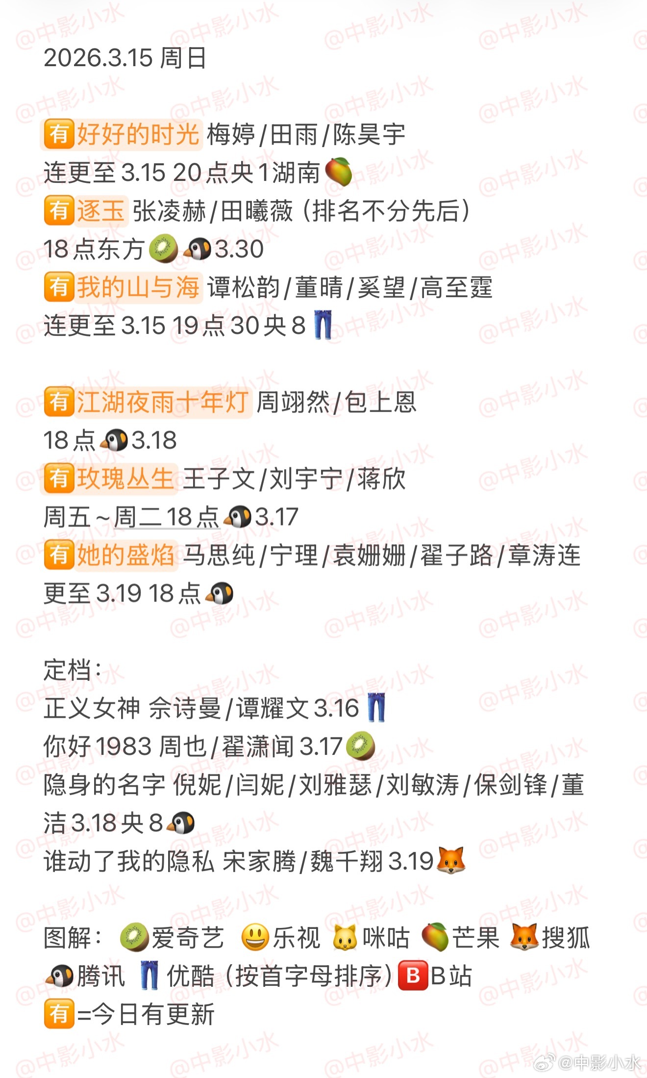 拯救剧荒 3月15日,今晚看点啥??图1 追剧日历 图2 综艺日历 图3 已完结剧集 🈶好好的时光 梅婷/田雨/陈昊宇🈶逐玉 张凌赫/田曦薇(排名不分先后)🈶我的山与海 谭松韵/董晴/奚望/高至霆