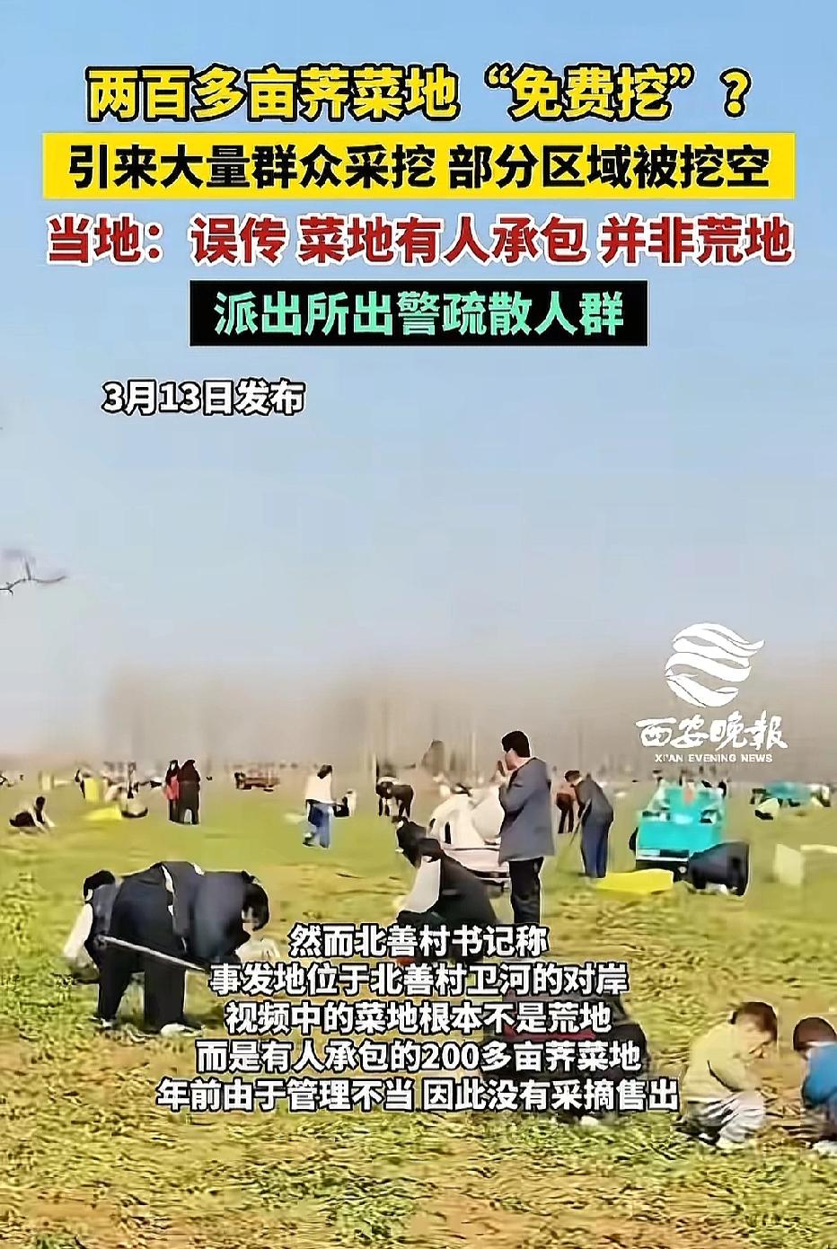 太嚣张!河南安阳,女子发现200亩荠菜,她不问主人,也不管地界,当场动手狂挖,还拍视频发到网上,甚至放话:免费的随便挖,还给出地址,消息一出,大批人蜂拥而至,整片荠菜被瞬间薅得精光。承包地主人赶到当场傻眼,拼命驱赶也拦不住,崩溃报警。女子结局大快人心! 事情刚发生时,谁也没想到会闹得这么大。 女子侯某某在外闲逛时,意外发现了一片长满鲜嫩荠菜的田地,足足200亩,长势喜人,一眼望不到边。 她当场就动了歪心思,既不打听这块地是谁承包的,也不问荠菜有没有主人,直接蹲在地里疯狂开挖,恨不得把整片地都搬回家。 更过分的是,她拿起手机对着镜头激动地大喊大叫:“哎呀呀呀!这些荠菜人家都不要了,咱们随便薅羊毛,大家快来呀,地址是xxx!” 视频里她得意洋洋,反复强调免费随便挖,还把精准地址公之于众,生怕别人找不到地方。 这条视频一发出,立刻像野火一样蔓延开来。附近的人看到消息,瞬间坐不住了。 有人拎着大塑料袋,有人背着编织袋,还有人全家出动、开车赶来,乌泱泱的人群一股脑冲进田地,二话不说就开始猛挖。 人越聚越多,场面彻底失控。大家只顾着抢菜,根本不管这是别人的私人承包地,你争我抢,连根拔起。 原本整整齐齐的田地,被踩得乱七八糟,泥土飞溅,菜根散落一地。不过半天时间,200亩荠菜就被薅得面目全非。 等到承包地主人闻到风声,急匆匆赶到现场,眼前的一幕让他当场傻眼,气得浑身发抖! 好好的一片地被糟蹋得不成样子,他拼命上前驱赶,可抢菜的人实在太多,根本拦不住,还有人理直气壮地喊:“网上都说免费了,你凭什么不让挖!” 主人又气又急,讲道理没人听,轰人轰不走,好好的财产被人肆意哄抢,却一点办法都没有,崩溃之下只能立刻报警。 警方赶到后,迅速疏散人群,固定证据,很快就找到了这场闹剧的始作俑者侯某某。 直到被警察找上门,她才慌了神,再也没有了当初拍视频时的嚣张气焰。 很多人觉得不就是挖点野菜吗,至于这么严重? 大错特错!这件事完全触犯了法律! 《民法典》第267条规定:私人的合法财产受法律保护,禁止任何组织或者个人侵占、哄抢、破坏。 《民法典》第331条规定:土地承包经营权人,对承包地享有占有、使用、收益的权利,地里长的东西都归承包者所有。 侯某某谎称“没人要、免费挖”,还故意煽动大批人哄抢,已经严重侵犯了他人财产权。 同时,她在网上散布虚假信息,引发人群聚集混乱,造成恶劣影响,也违反了《治安管理处罚法》,必须承担法律责任。 最终,侯某某被依法严肃处理,不仅要全额赔偿土地主人的经济损失,还要接受行政处罚,为自己的无知和贪婪买单。 消息传出,网友们纷纷拍手叫好,这个结局真的大快人心! 有网友直言:地里长的东西,哪怕是野草,只要在承包地里,就是人家主人的财产,凭什么让你免费薅?太不讲理了! 还有网友表示:最可气的是大家一窝蜂上去抢,法不责众的心态最可怕,占小便宜也要守底线、守法律! 不少网友批评女子侯某某:为了博眼球毫无底线,一句不负责任的话,害得别人损失惨重,必须承担全部责任! 一句任性的喊话,一场失控的哄抢,一次惨痛的教训。侯某某因为一时贪念,随手煽动他人闯下大祸,最后自食恶果。 这件事也给所有人敲响警钟:天上不会掉馅饼,不是自己的东西绝不能拿,网络不是法外之地,乱说话、乱煽动,迟早要为自己的行为付出代价! 对此,你怎么看?