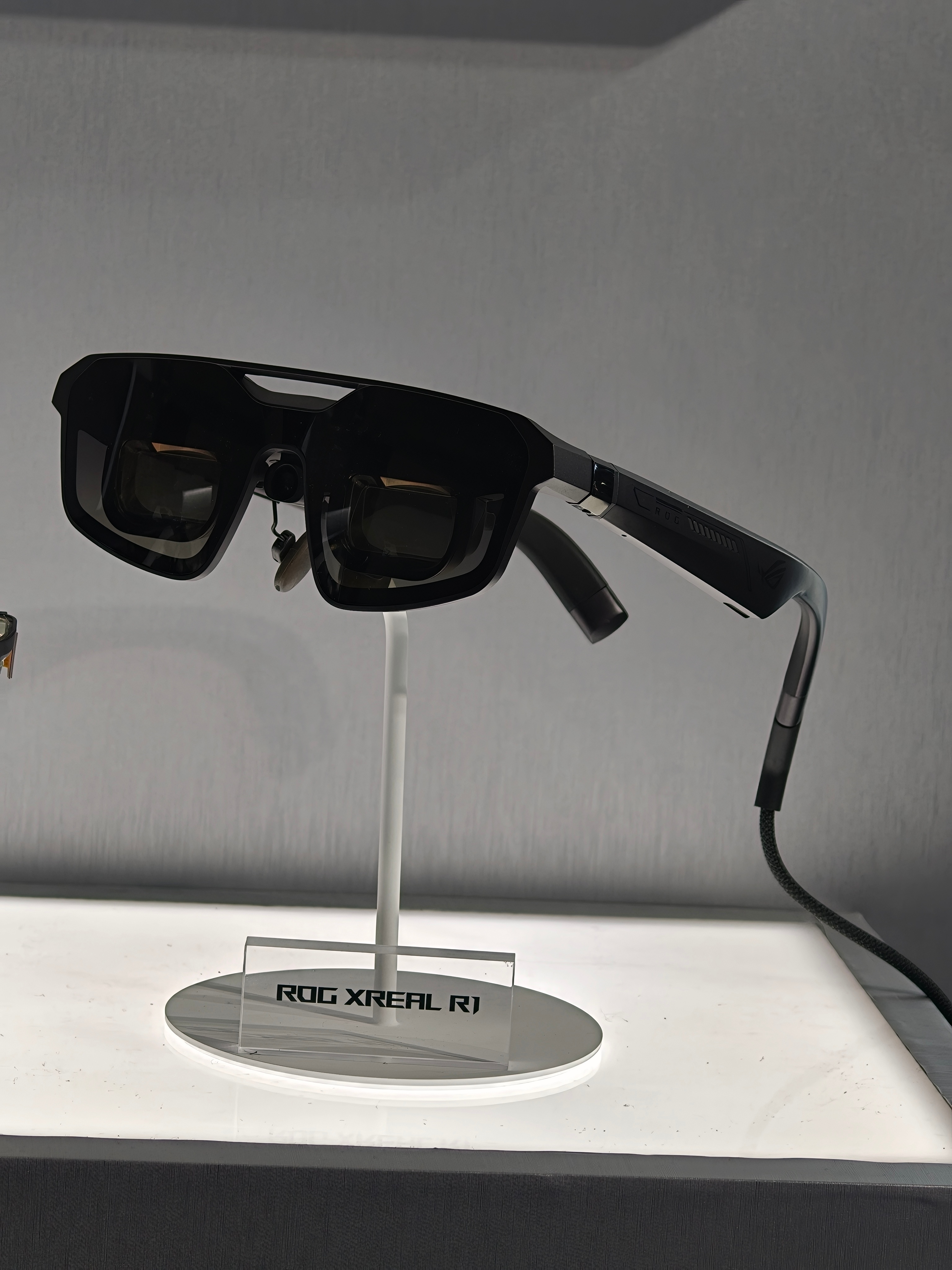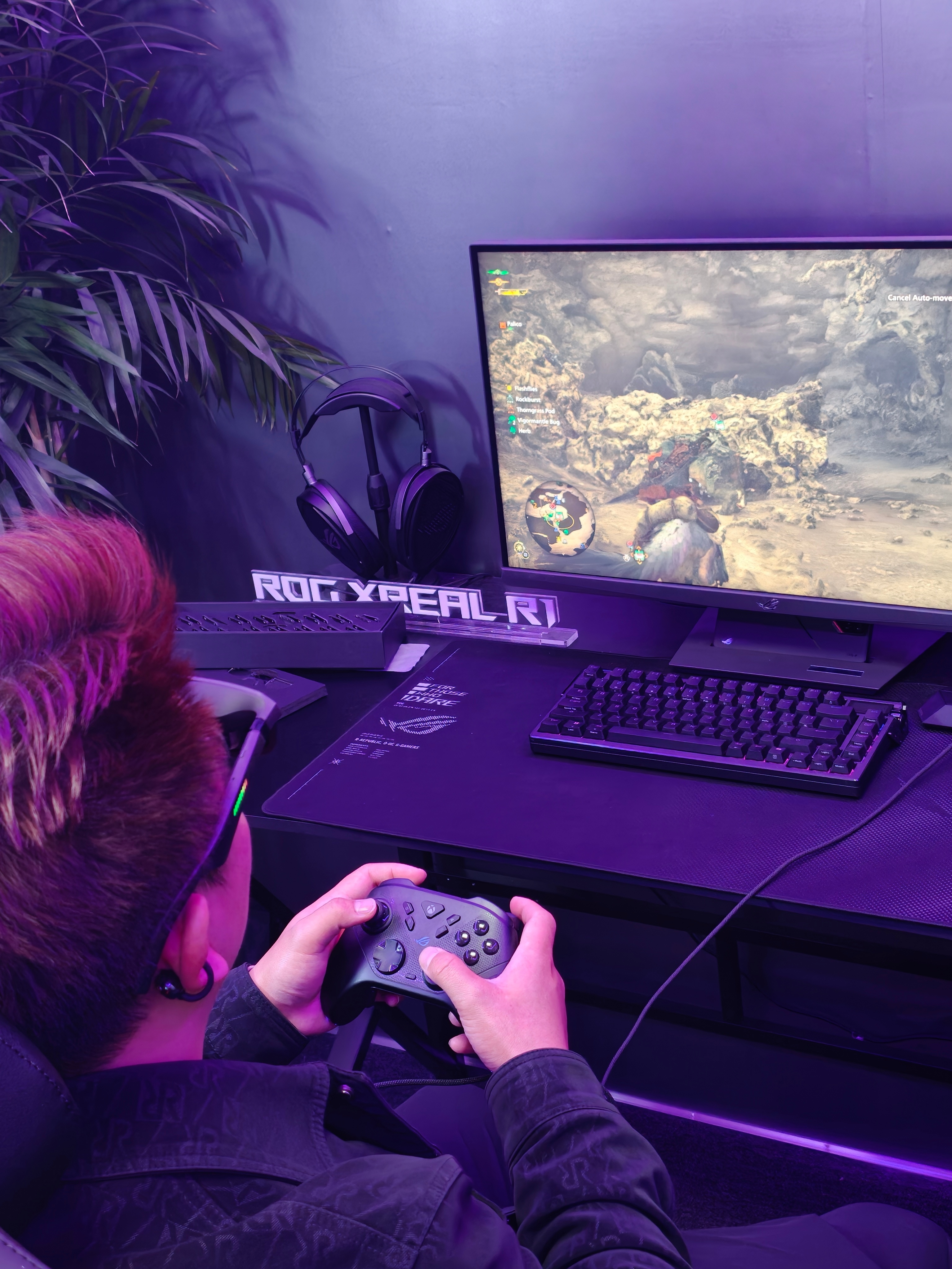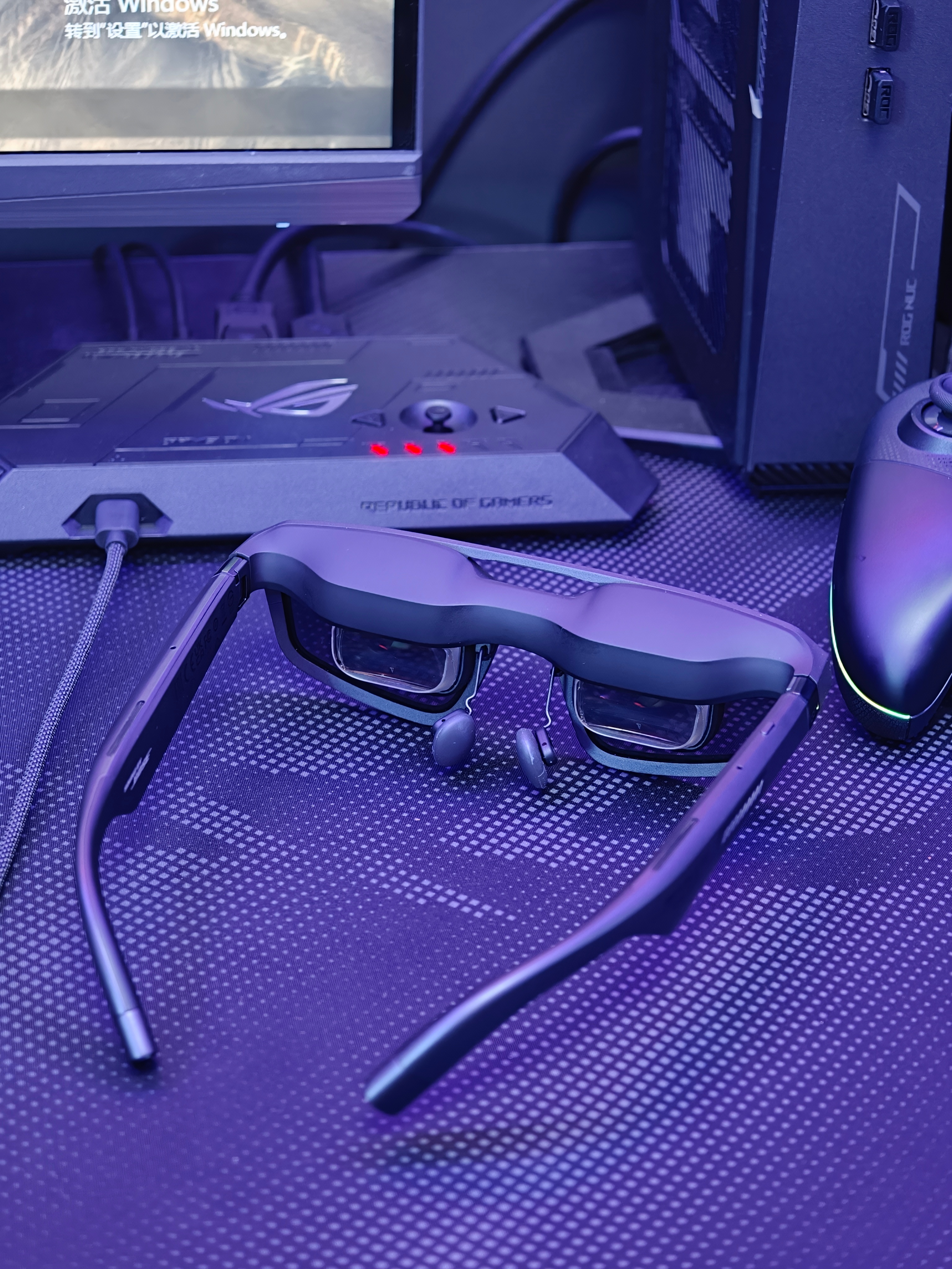 我觉得最惊艳的还是ROG联名的ROG XREAL R1,基于 XREAL One Pro 硬件开发的,240Hz高刷,镜腿自带RGB灯条,搭配ROG Dock全设备通吃,PC/PS5/Xbox/ROG Ally一键切换,现场试玩《怪物猎人 荒野》,高刷无拖影、低延迟跟手,而且完全不会觉得晕,很有继续玩游戏的欲望!可以穿戴的信仰之力,真的是太爽了~