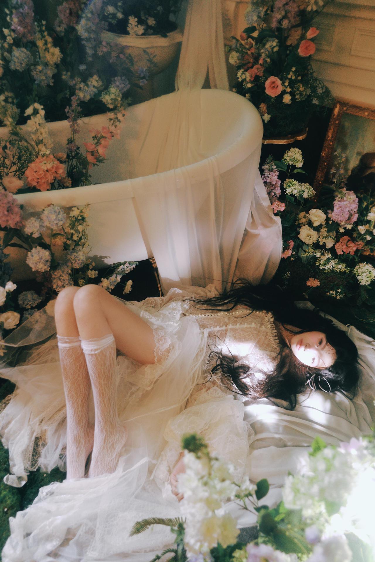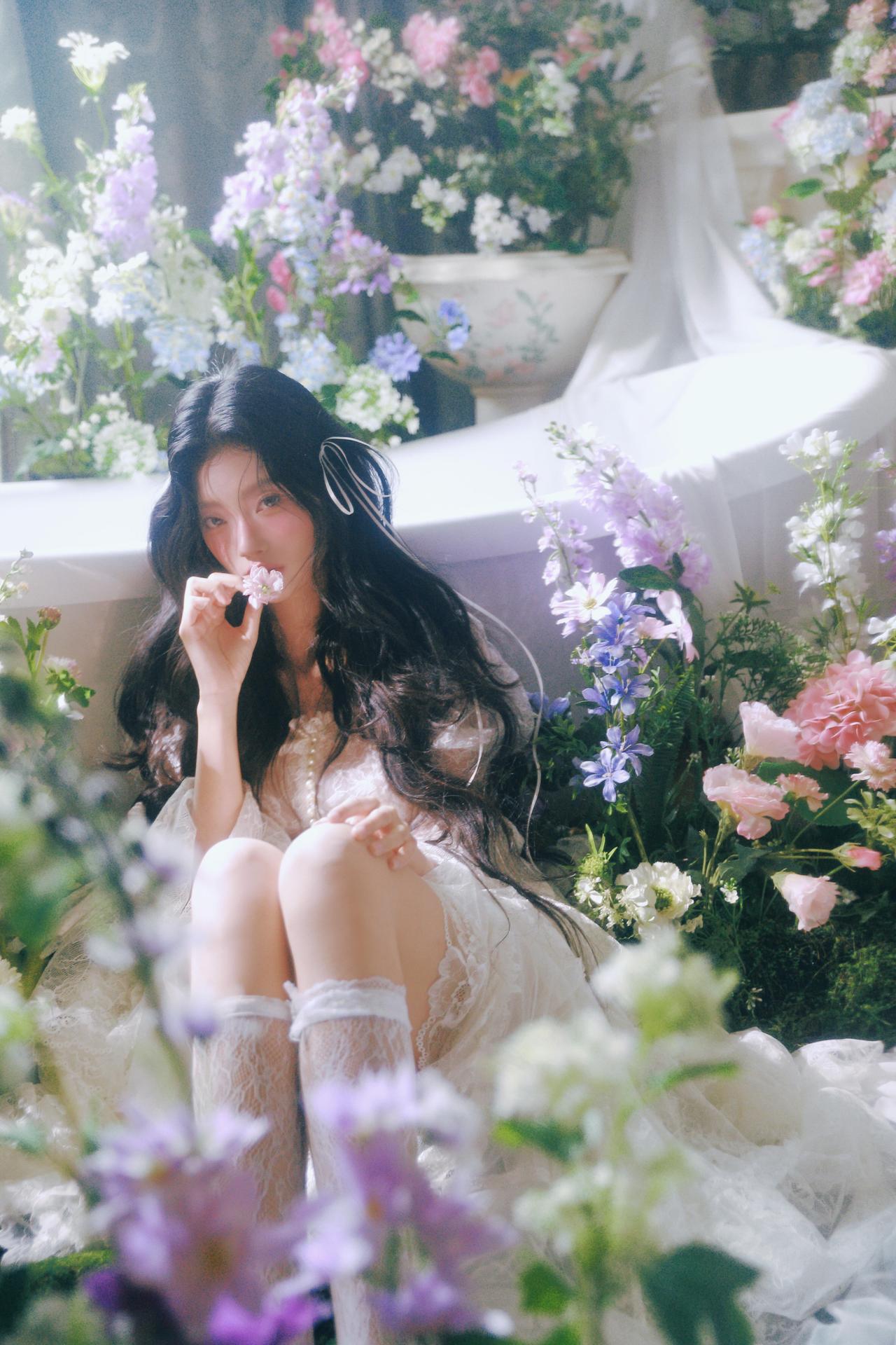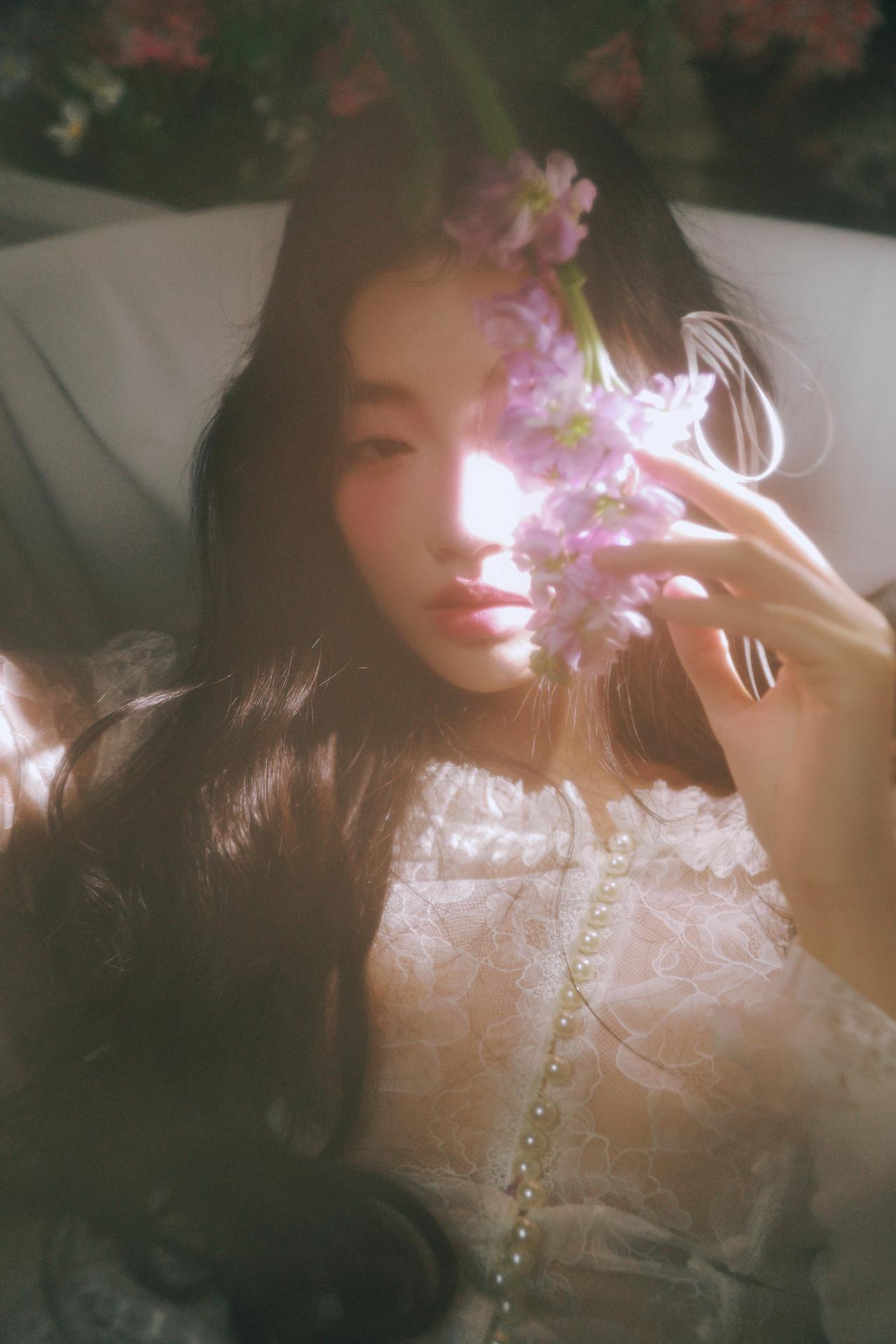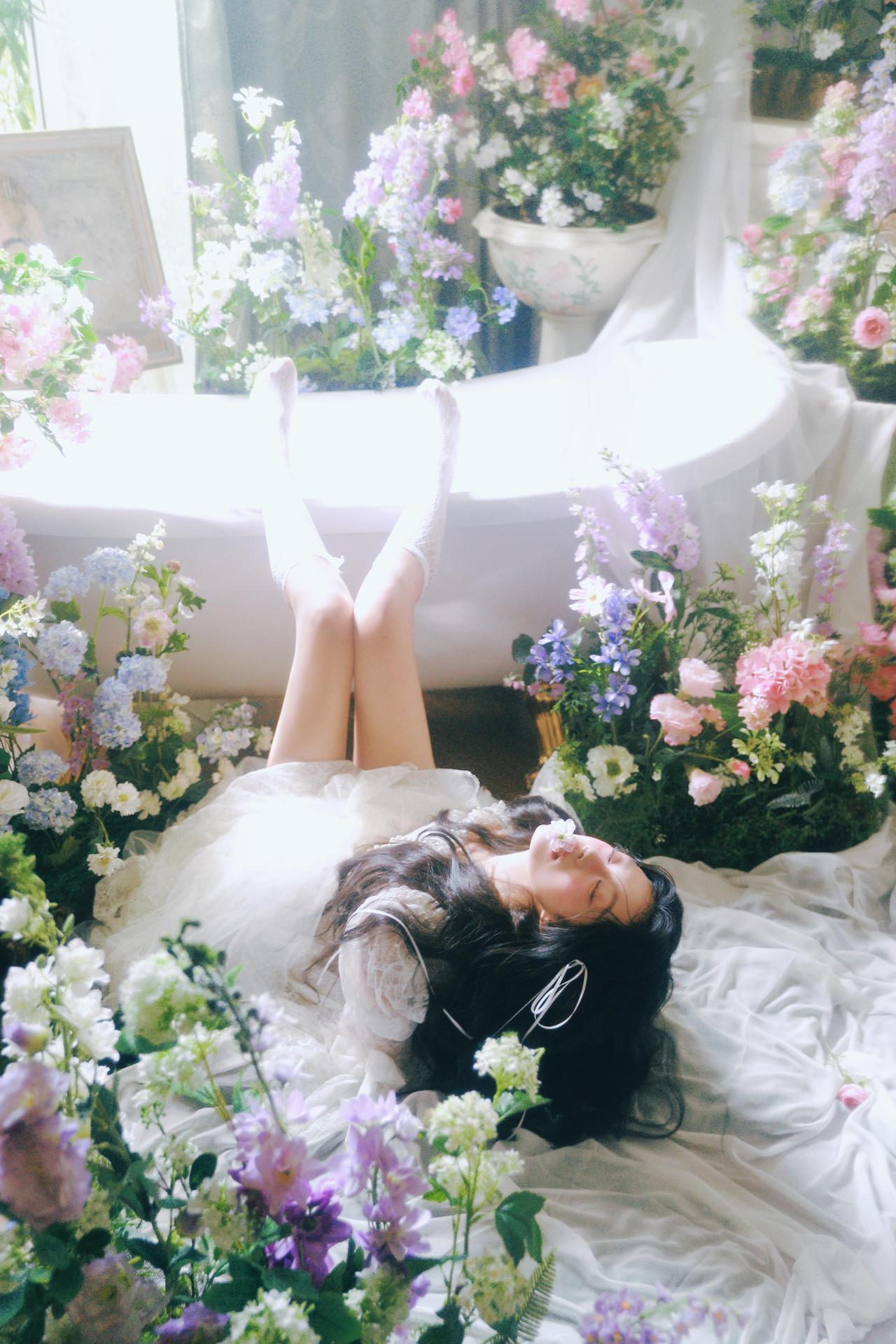 你在拍照时对“留白”是如何理解的?还有“情绪”呢? 不同于满铺花簇的构图,部分画面将少女置于画面一侧,留出大量空间给光影与花境,让视觉节奏更舒缓。例如第三张图,花枝半遮面部,光线从侧方穿透花瓣,在脸颊形成斑驳的光斑,既保留了神秘感,又让情绪更含蓄内敛,避免了直白的表情传递。 色彩上,整体采用低饱和度的莫兰迪色调,白色裙装与淡紫色、蓝色花材形成和谐呼应,弱化了视觉冲击,更偏向复古胶片的温柔质感。摄影师对快门速度的控制也值得称道,在捕捉发丝飘动的瞬间时,既保留了动态模糊的灵动,又确保了面部清晰度,让画面在“静”与“动”之间找到平衡。 构图上,对角线与曲线的运用让画面更具呼吸感,比如第五张图中少女仰躺的姿态,腿部线条与花簇形成自然延伸,打破了静态构图的呆板。整体来看,这组作品用光影与构图传递情绪,是充满叙事感的春花人像范本。