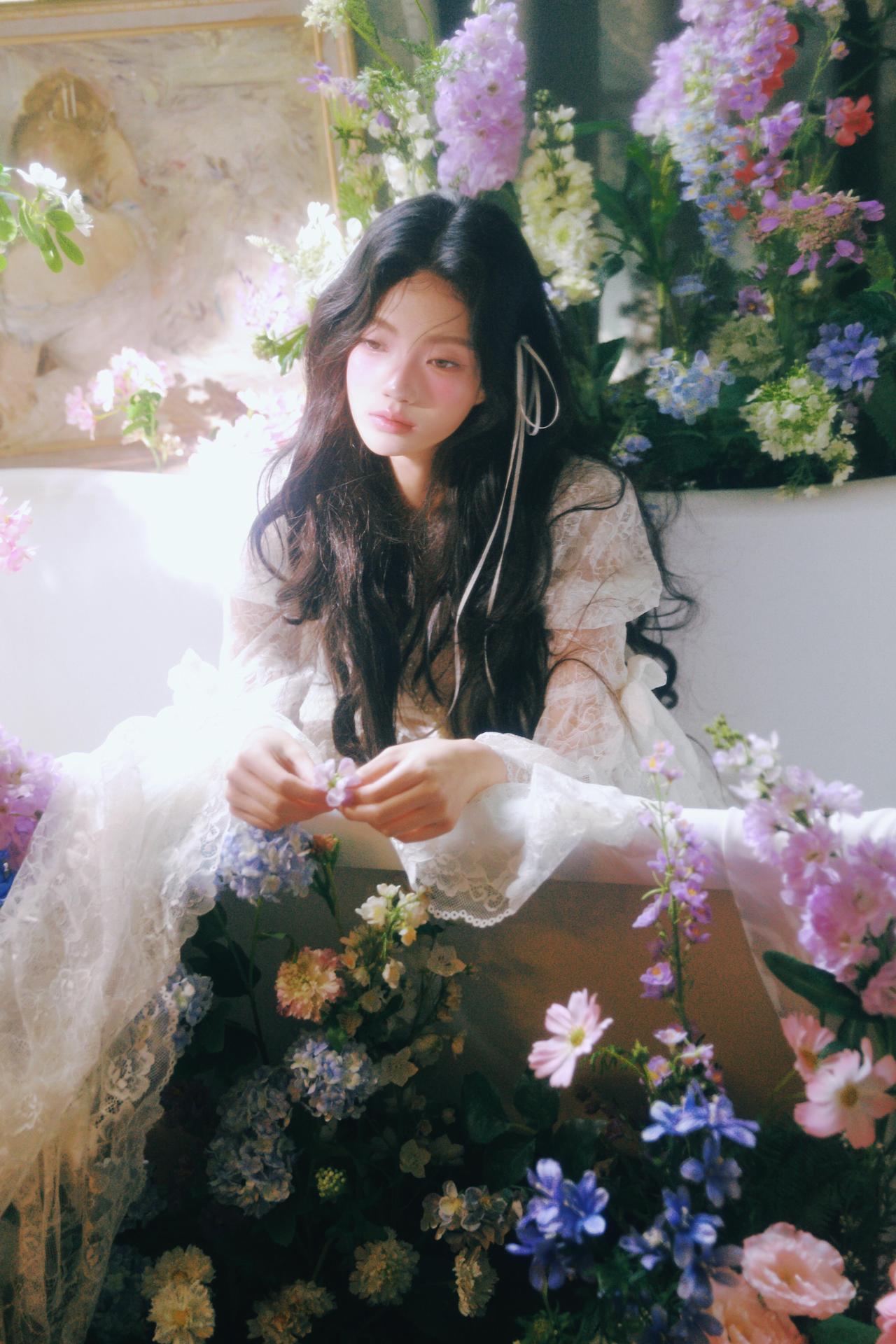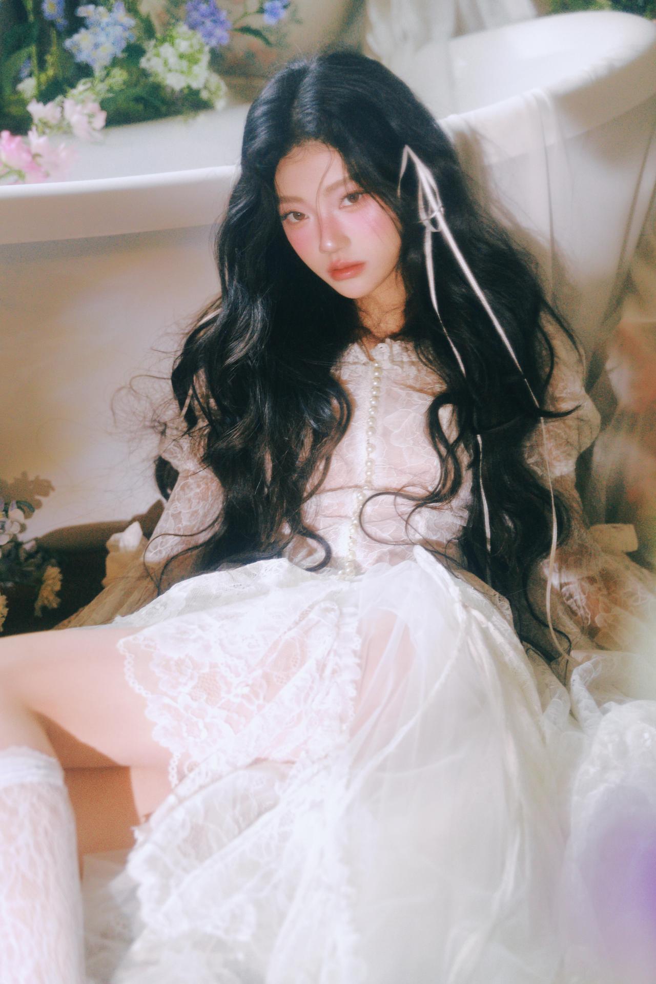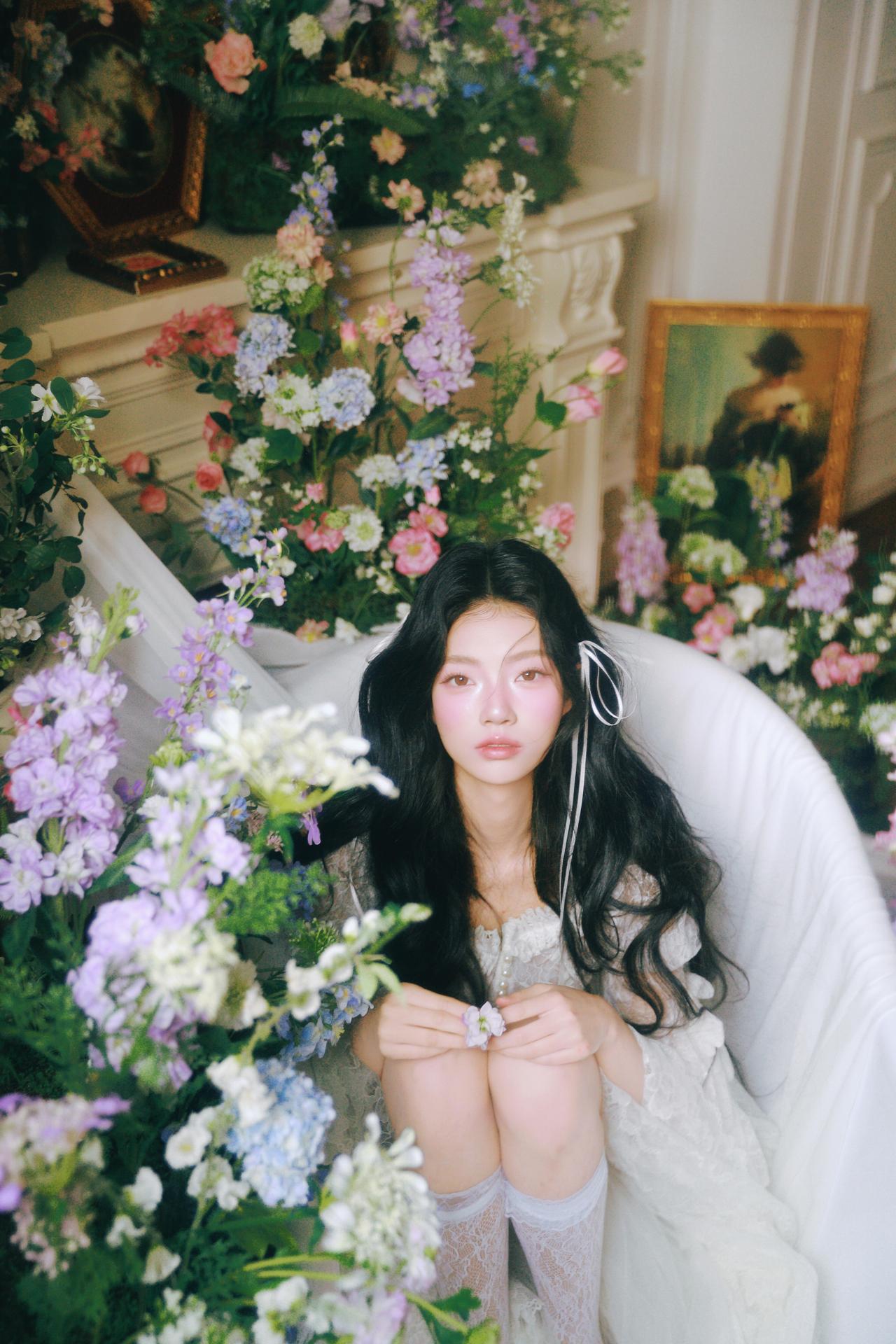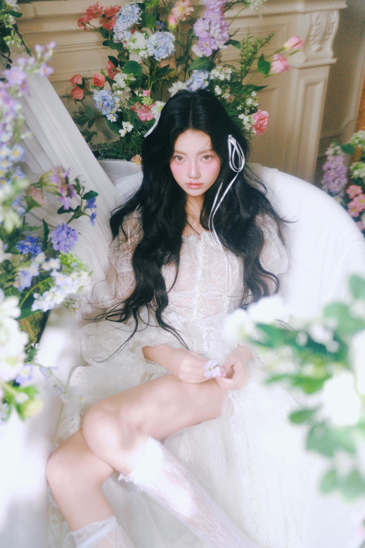 你在拍照时对“留白”是如何理解的?还有“情绪”呢? 不同于满铺花簇的构图,部分画面将少女置于画面一侧,留出大量空间给光影与花境,让视觉节奏更舒缓。例如第三张图,花枝半遮面部,光线从侧方穿透花瓣,在脸颊形成斑驳的光斑,既保留了神秘感,又让情绪更含蓄内敛,避免了直白的表情传递。 色彩上,整体采用低饱和度的莫兰迪色调,白色裙装与淡紫色、蓝色花材形成和谐呼应,弱化了视觉冲击,更偏向复古胶片的温柔质感。摄影师对快门速度的控制也值得称道,在捕捉发丝飘动的瞬间时,既保留了动态模糊的灵动,又确保了面部清晰度,让画面在“静”与“动”之间找到平衡。 构图上,对角线与曲线的运用让画面更具呼吸感,比如第五张图中少女仰躺的姿态,腿部线条与花簇形成自然延伸,打破了静态构图的呆板。整体来看,这组作品用光影与构图传递情绪,是充满叙事感的春花人像范本。