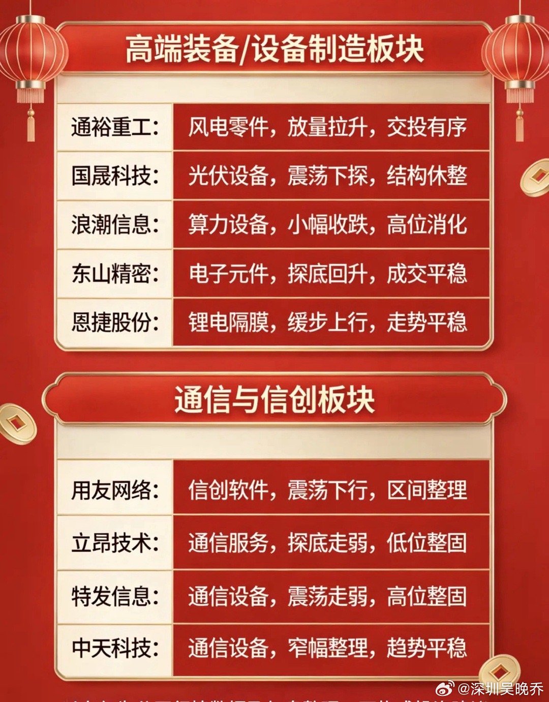 通裕重工:风电零件,放量拉升,交投有序国晟科技:光伏设备,震荡下探,结构休整浪潮信息:算力设备,小幅收跌,高位消化东山精密:电子元件,探底回升,成交平稳恩捷股份:锂电隔膜,缓步上行,走势平稳