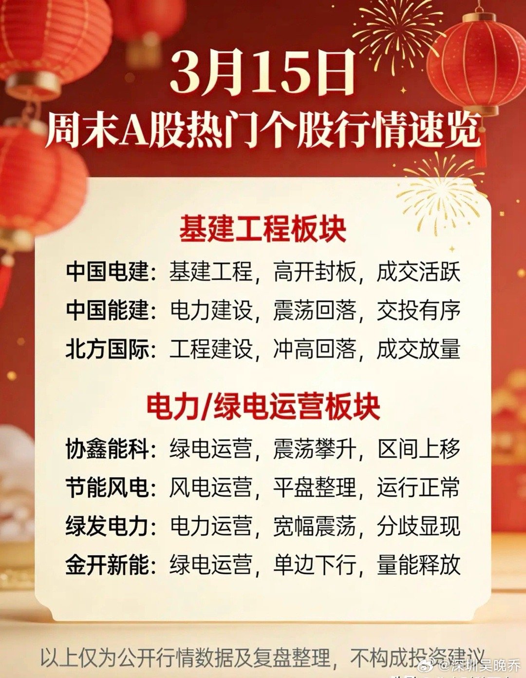 中国电建:基建工程,高开封板,成交活跃中国能建:电力建设,震荡回落,交投有序北方国际:工程建设,冲高回落,成交放量