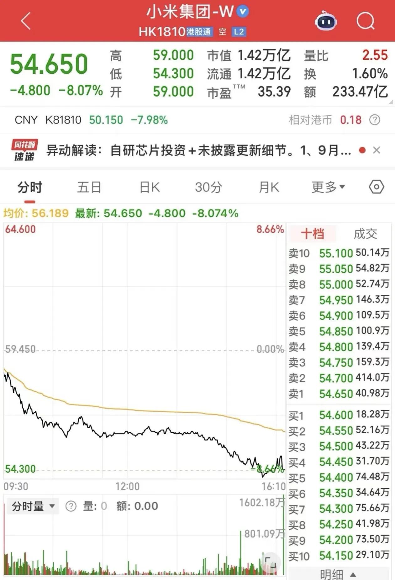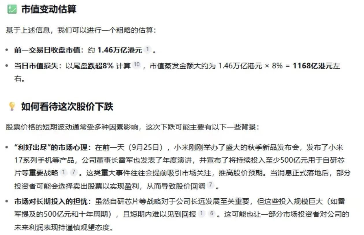 一场发布会后,超千亿市值蒸发 昨晚,雷军以“改变”为主题带来年度演讲,回顾了小米过往取得的成就,还表示为了在芯片与汽车领域实现突破,“把前十年的家底全押上了”。随后,小米发布了小米17系列、平板8系列等新品,发布期间提及苹果30余次。 尽管雷军称新品对标苹果且价格更具优势,但这并未消除市场的顾虑。 截至收盘,小米股价下跌8.07%,至166.500港元,市值蒸发约1100多亿港元。 对于小米股价下跌,Deepseek分析出两个原因: 一是利好出尽; 二是投资芯片和汽车的规模较大,短期内难以获得回报。