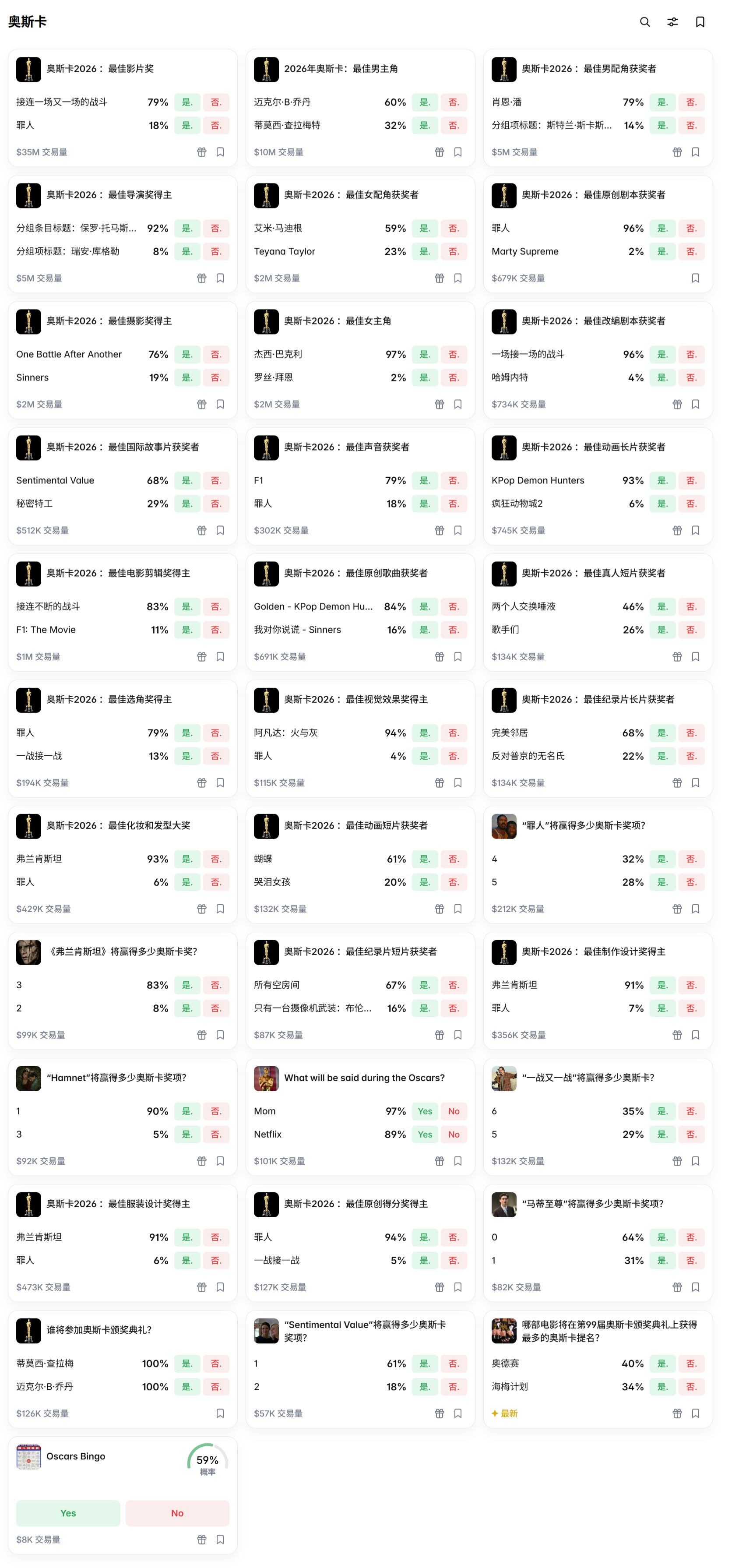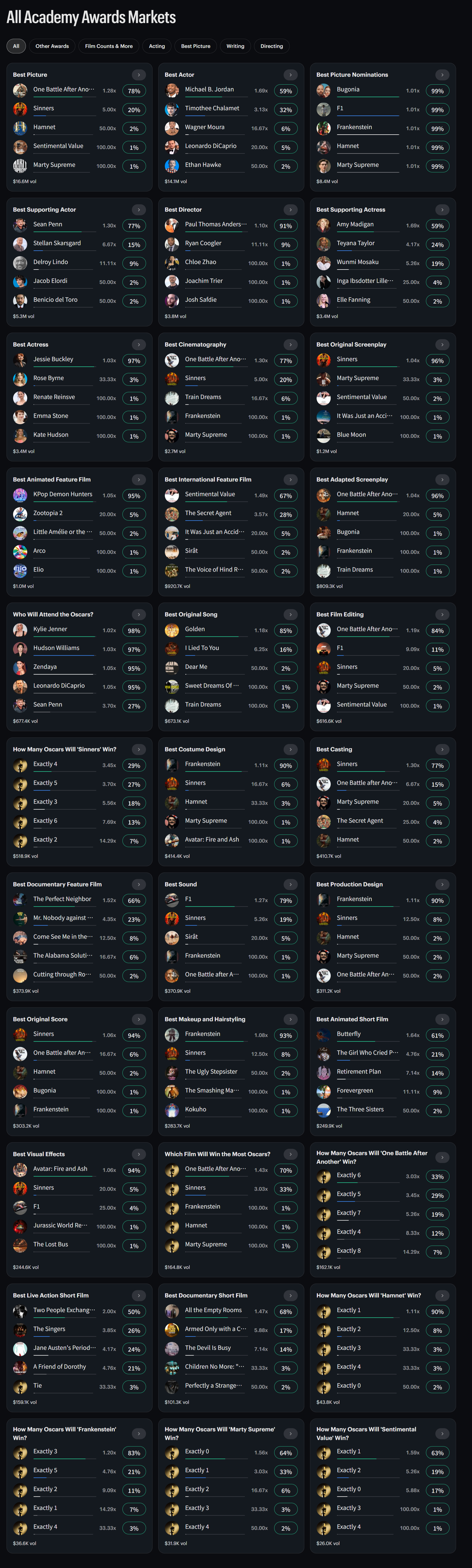 截至目前各家公司对今年第98届奥斯卡各大奖项的预测对比!很多奖项已经基本提前锁定了,当然像影帝等依然充满了悬念。坐等早上7点开始颁奖礼。最佳影片:《一战再战》(77%-79%)最佳导演:保罗·托马斯·安德森《一战再战》(91%-95%)最佳男主角:迈克尔·B·乔丹《罪人》(59%-63%)Timothée Chalamet《至尊马蒂》(25%-32%)最佳女主角:杰西巴克利《哈姆奈特》(97%-98%)最佳男配角:肖恩·潘《一战再战》(73%-79%)最佳女配角:Amy Madigan《凶器》(59%-62%)乌米·马萨库《罪人》(19%-20%)Teyana Taylor《一战再战》(16%-24%)最佳原创剧本:《罪人》 (96%-97%)最佳改编剧本:《一战再战》(96%)最佳动画长片:《Kpop猎魔女团》(93%-96%)最佳国际影片:《情感价值》挪威(67%-73%)《密探》巴西(25%-29%)最佳纪录长片:《完美邻居》(66%-83%)最佳原创配乐:《罪人》(94%-97%)最佳原创歌曲:“Golden”《Kpop猎魔女团》(84%-90%)最佳艺术指导:《科学怪人》(90%-92%)最佳摄影:《一战再战》(59%-77%)《罪人》(19%-29%)最佳剪辑:《一战再战》(83%-92%)最佳视觉效果:《阿凡达3》(94%-96%)最佳音响:《F1:狂飙飞车》(79%-87%)最佳化妆与发型设计:《科学怪人》(93%-97%)最佳服装设计:《科学怪人》(90%-94%)最佳选角:《罪人》(77%-92%)最佳真人短片:《两个人交换唾液》(46%-50%)《多萝西的一位朋友》(21%-39%)《歌手们》(10%-26%)最佳动画短片:《蝴蝶》(61%-76%)《泪珠成珍的女孩》(13%-21%)最佳纪录短片:《静室为证》(67%-88%)《烽火孤镜:布伦特·雷诺的战地人生》(6%-17%)