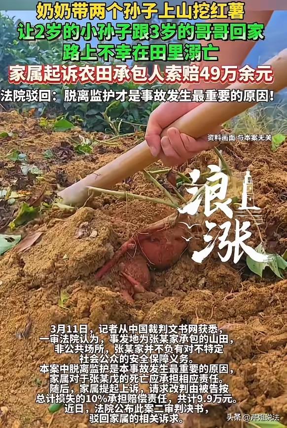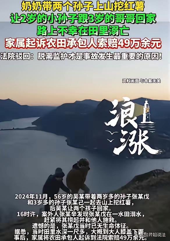 这个案件确实令人非常痛心,但从法律角度来看,判决结果有其合理性,主要依据如下: 承包主张某没有过错 张某依法承包了荒地,进行田地整理和耕种,这是其合法的土地使用行为。水田作为农业生产用地,不属于公共场所,也不是人为设置的危险区。张某没有设置危险陷阱,也未违反安全管理义务,不能因此承担安全保障责任。法律上通常不会要求农田设置围栏或警示标志,除非有明确规定或存在明显过错。 监护人吴某存在监护失职 根据《民法典》规定,监护人应当妥善履行对未成年人的保护义务。两个孩子年幼,没有自我保护能力,吴某却让他们单独返回,期间发生意外,明显属于监护失职。监护人的失责是造成悲剧的直接原因,法律上应承担主要甚至全部责任。 法律原则:过错责任 侵权责任法基本原则是“过错责任”,即有过错方承担赔偿义务。此案中,承包主无过错,监护人有过错。法院依据法律规定判决符合现有司法实践和法律精神,体现的是法律的公平和理性,而非感情用事。 心理层面理解悲痛,但不能转嫁责任 家属痛失亲人情感上令人同情,但不能以悲痛为理由对无辜者追责,否则会造成不公平并影响社会秩序。法律保护的是权利和责任的对等。 个人观点: 我支持法院判决,认为责任应由监护人承担。作为监护人,应当时刻注意未成年人的安全,尤其是年幼孩子离开视线范围时的潜在危险。家庭悲剧令人心碎,但法律必须依据事实和责任划分。加强监护意识,避免类似事故发生,是更重要的社会教育意义。 也欢迎大家在评论区分享你们的看法,讨论如何平衡悲痛与责任,以及如何改进儿童安全保护措施。未质证的判决 乡村土地纠纷