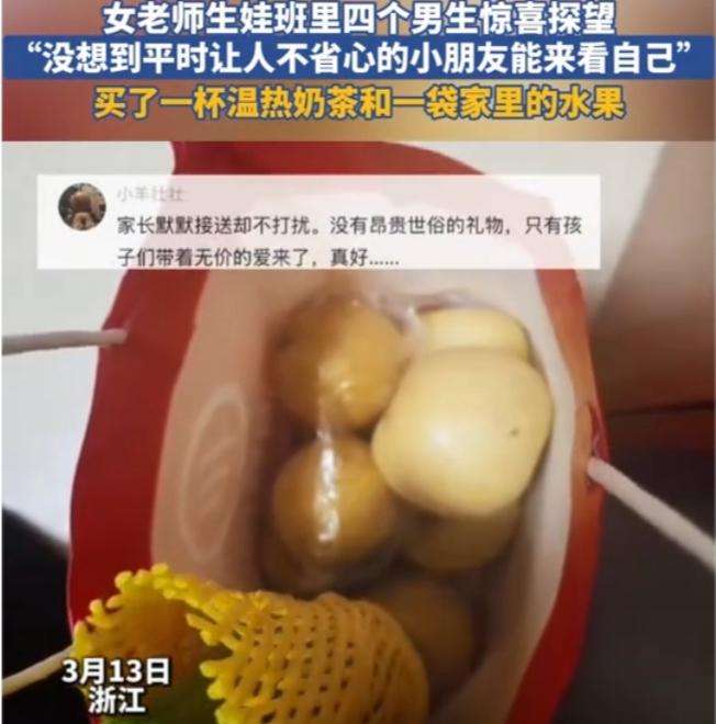 太好哭了!浙江女老师产后刚2天,4个小男孩悄悄摸到医院,手里的礼物看哭全网 太暖了!浙江,女老师在医院生完孩子的两天后,病房门被轻轻推开,进来的不是家人,不是同事,而是她班里四个小小的身影。 他们踮着脚、攥着东西,小心翼翼地走进病房,生怕吵到刚生产完的老师。手里没有昂贵的礼盒,只有一杯冒着热气的奶茶,和一袋沉甸甸的、从家里带来的新鲜水果。 女老师瞬间红了眼眶,她自己都懵了:这群孩子,到底是怎么打听到医院、问到病床号的? 没有家长陪同,没有大人安排,四个小男孩凭着一股最纯粹的惦记,偷偷跑来看望他们最爱的老师。 他们话不多,就安安静静站在床边,把热奶茶和水果往床头一放,眼神里全是藏不住的关心。那一点点笨拙、一点点拘谨,却比任何华丽的祝福都戳心。 网友瞬间破防:这哪里是学生,这是把老师放在心尖上的小暖男啊! 有人说,现在的孩子娇生惯养,不懂感恩;有人说,师生情早就淡了。可这四个孩子,用最朴素的行动,告诉我们:孩子的爱,最直白、最干净、也最动人。 老师用心教,孩子用心记,你曾给他们温暖与陪伴,他们便用最稚嫩的方式,回馈给你最滚烫的真心。 这杯热奶茶,暖的不只是老师的手,更是无数人被生活磨冷的心。#四个小男孩##浙江男孩##暖心的师生日常