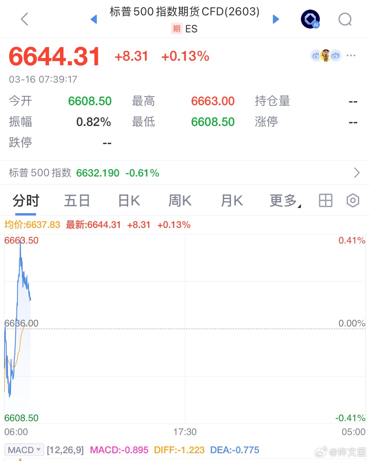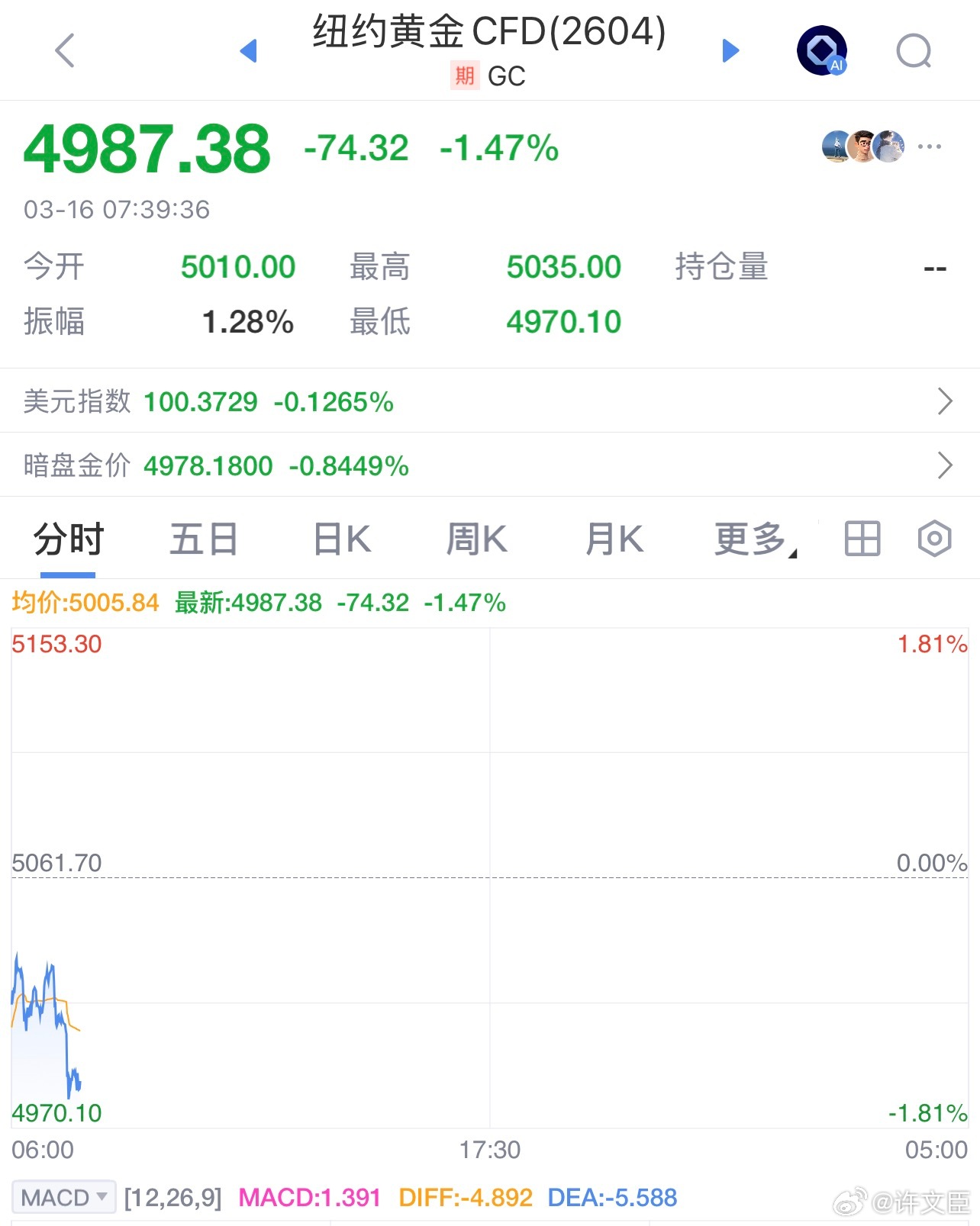 原油价格并未出现周末网友预测的暴涨,今天高开后已经出现回落,大家不要太悲观,另外黄金 k 线真的很难看,建议多观望少操作,尽量别“抄底”。金价许文臣