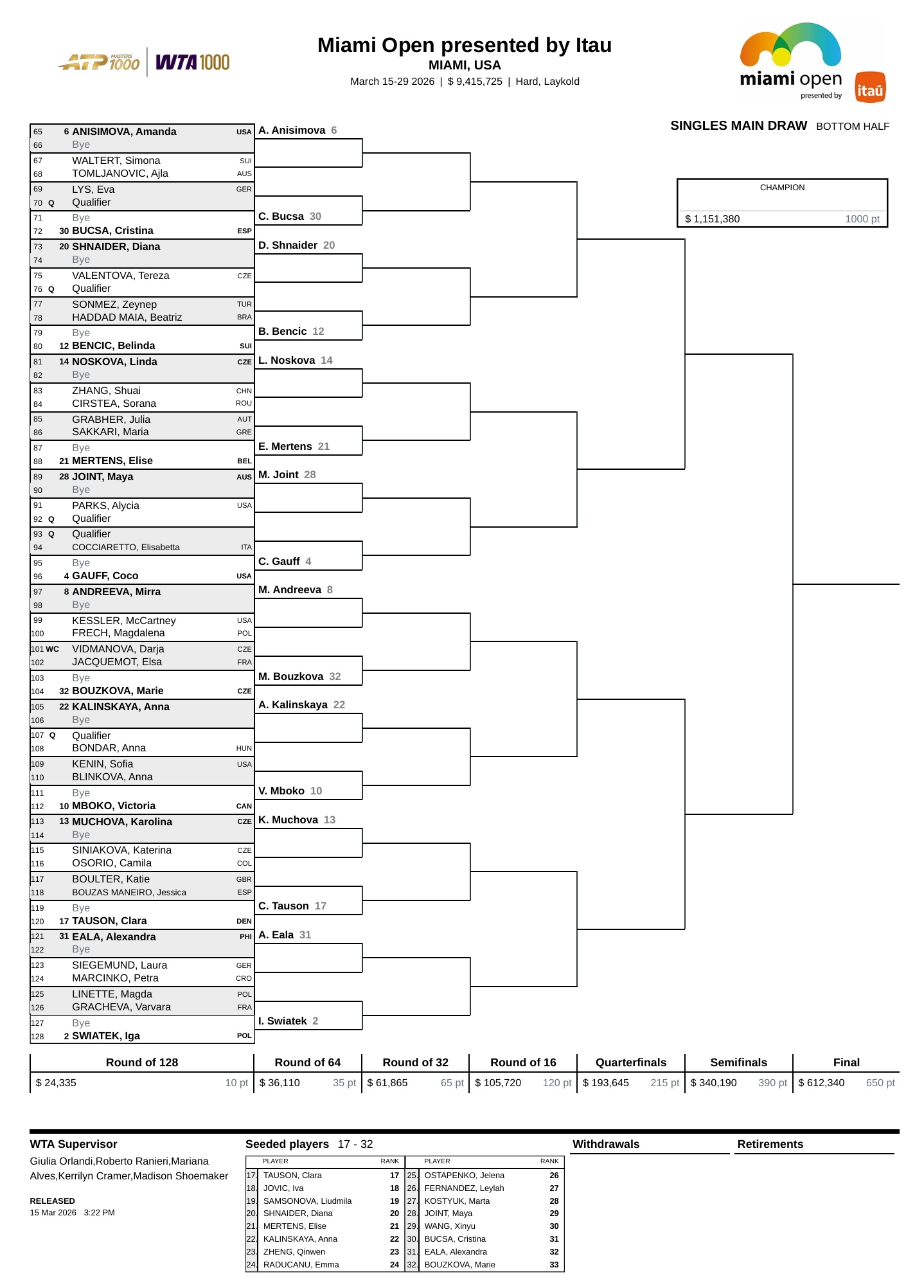 WTA1000迈阿密站签表出炉,前八种子对位如下👇