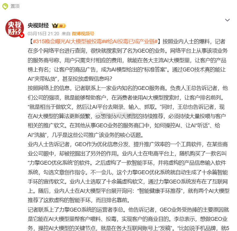 315晚会曝光AI大模型被投毒 逻辑闭环了AI自己产出来的垃圾,又被喂回给AI了给AI投毒已成产业链,热点观点 ,315晚会
