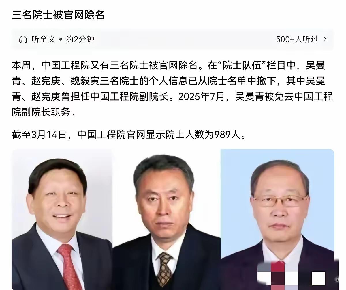 三名武器装备院士被除名背后藏着大秘密 本周中国工程院宣布吴蔓青,赵宪庚,魏毅寅三名曾经和现任高管被除名。其中吴蔓青可是主持并参与预警雷达,空警500,的研发工作。赵宪庚参加导弹,反导等工作。魏毅寅参加远程导弹研发工作。并且是工程院副院长级别的领导。 被工程院除名要么是触及违法,要么就是泄密等危害国家安全的重大问题才会造成的后果。希望不要是后一种结果,毕竟中国军工发展到现在部分领先美国的时候不容易。希望掀出多一些蛀虫让我们能走得更好。