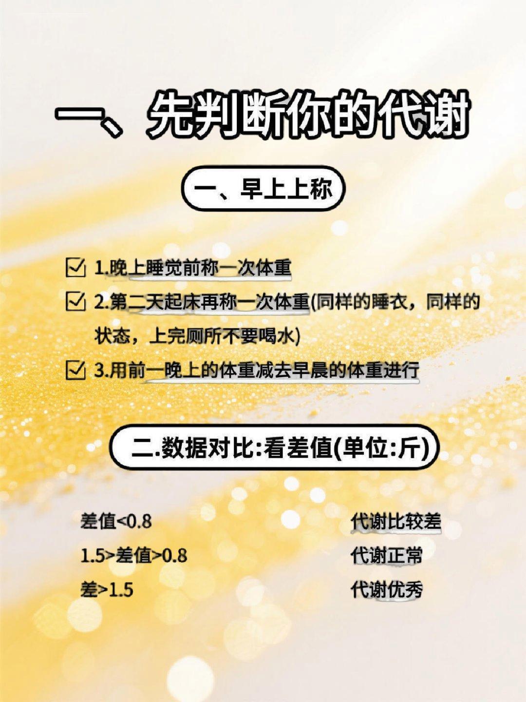 先自测代谢水平:晚上睡前称重,第二天早晨空腹称重,用睡前体重减去晨起体重。差值小于0.8斤:代谢较差0.8—1.5斤:代谢正常大于1.5斤:代谢优秀