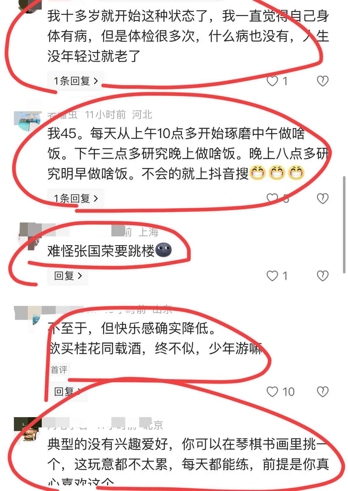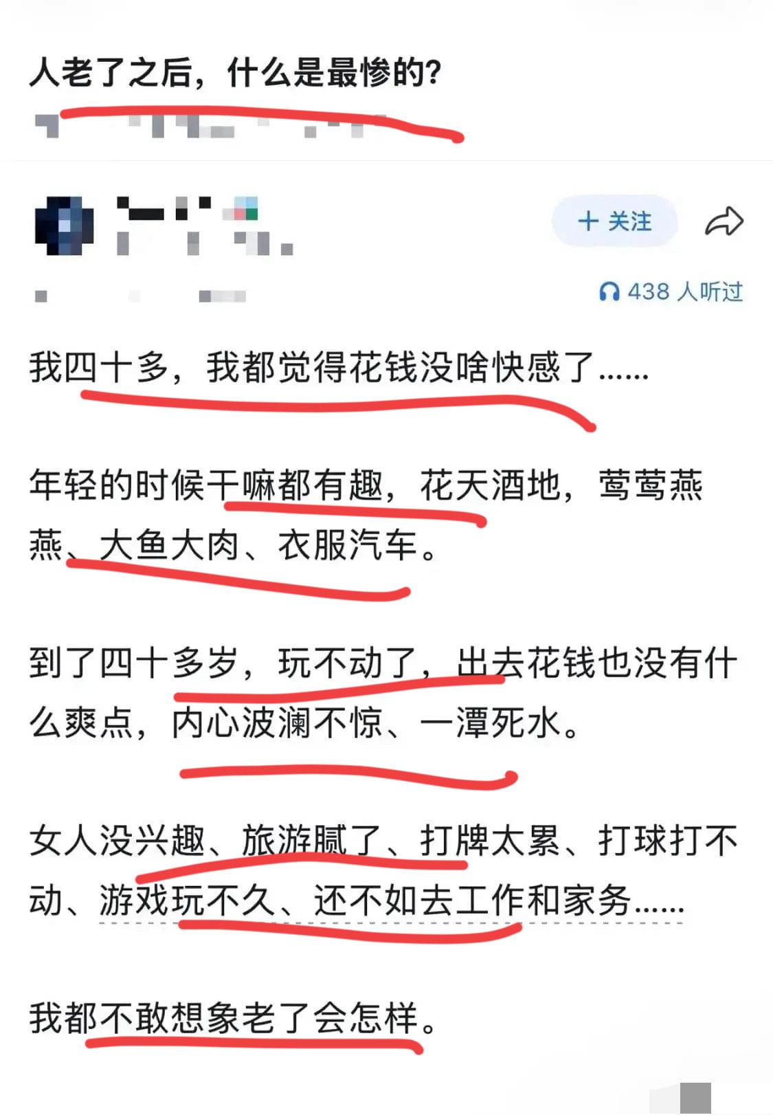 这位老哥,咋了呢? 四十岁,感觉干什么都没劲了吗? 人到中年万事休?? 不会吧,年轻的时候,干啥了都!! 网友说,真是这样吗,那就太恐怖了,想想都可怕。 四十多岁,花钱都没有快感了吗? 吃喝玩乐,连对女人都无感了。 老了会怎样呢,他自己都无法想象了。 这是一种病吗,还是普遍现象呢? 哎,我看到有人评论说,袁爷爷让你们吃得太饱了!!
